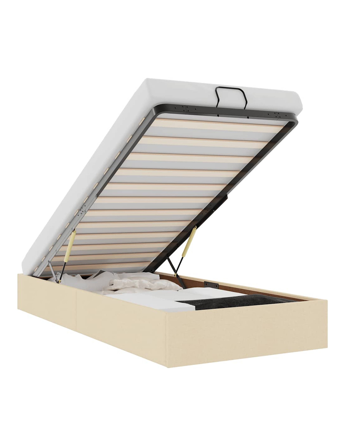 - Comodo meccanismo di sollevamento: Il meccanismo di sollevamento idraulico integrato consente un facile accesso agli effetti personali riposti sotto il letto. Con una semplice trazione della maniglia, la base a doghe si solleva dolcemente, permettendoti di recuperare i tuoi oggetti in modo rapido e senza sforzo.