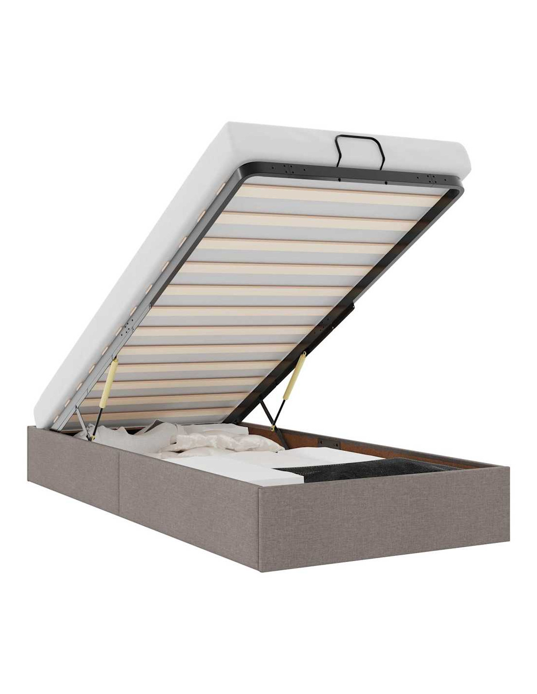 - Comodo meccanismo di sollevamento: Il meccanismo di sollevamento idraulico integrato consente un facile accesso agli effetti personali riposti sotto il letto. Con una semplice trazione della maniglia, la base a doghe si solleva dolcemente, permettendoti di recuperare i tuoi oggetti in modo rapido e senza sforzo.