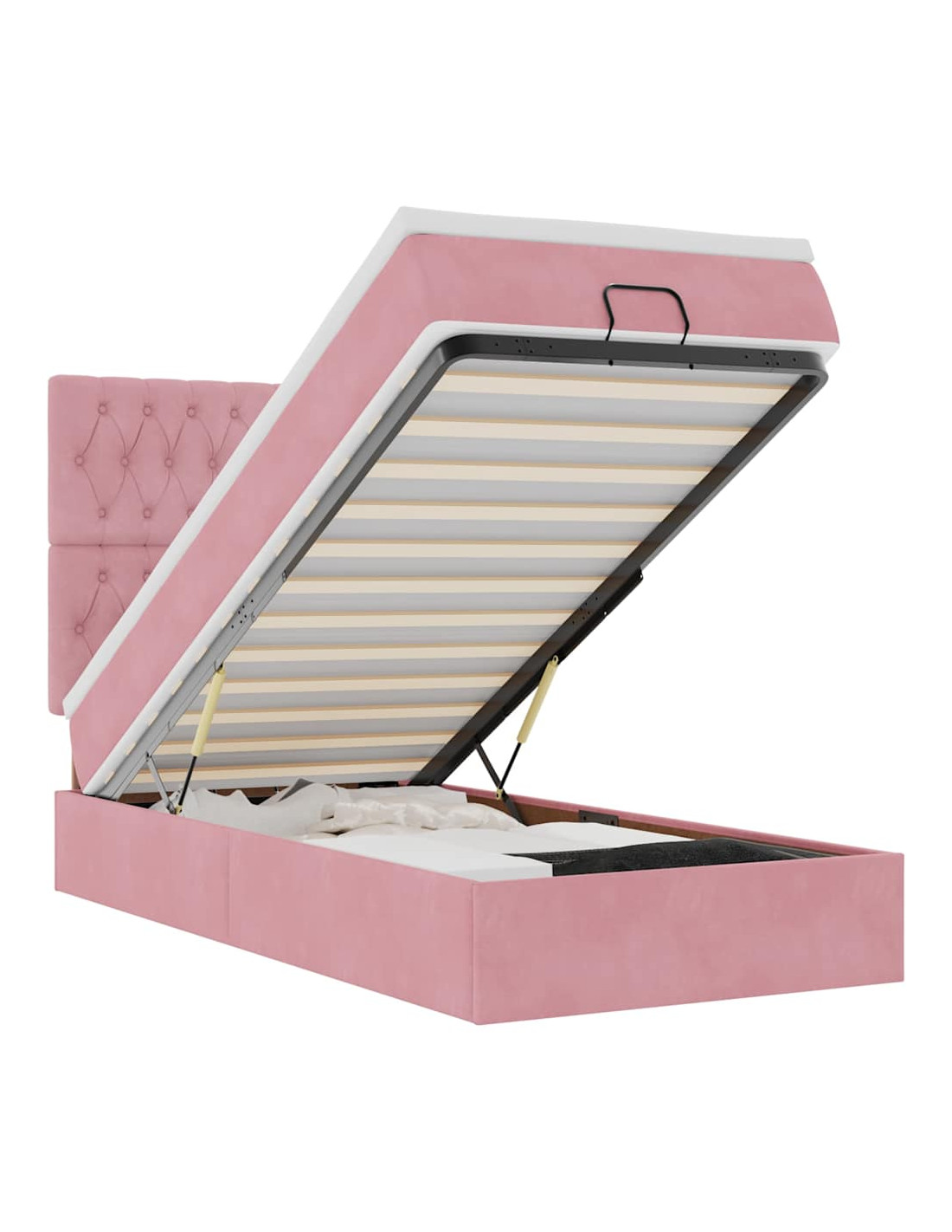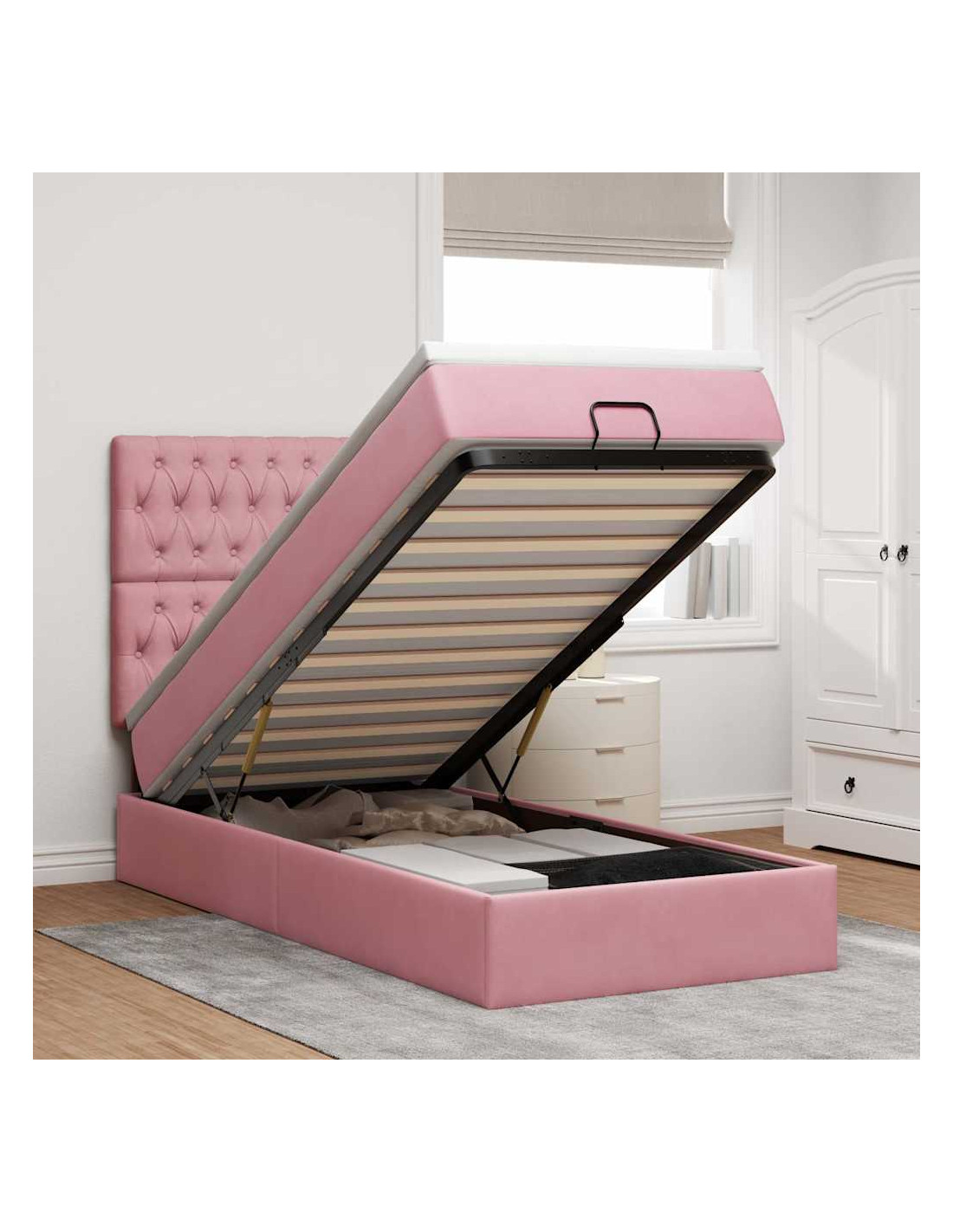 - Ampio vano portaoggetti sotto il letto: Grazie al meccanismo di sollevamento idraulico, il giroletto offre un ampio spazio sotto il letto, massimizzando lo spazio senza occupare ulteriore spazio sul pavimento. Con una semplice trazione della maniglia, la base a doghe si solleva dolcemente, permettendoti di recuperare i tuoi oggetti in modo rapido e senza sforzo.