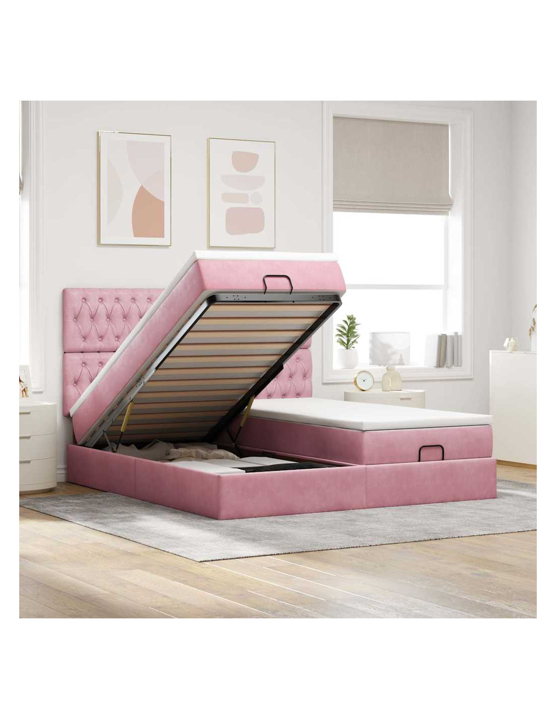 • Ampio vano portaoggetti sotto il letto: Grazie al meccanismo di sollevamento idraulico, il giroletto offre un ampio spazio sotto il letto, massimizzando lo spazio senza occupare ulteriore spazio sul pavimento. Con una semplice trazione della maniglia, la base a doghe si solleva dolcemente, permettendoti di recuperare i tuoi oggetti in modo rapido e senza sforzo.