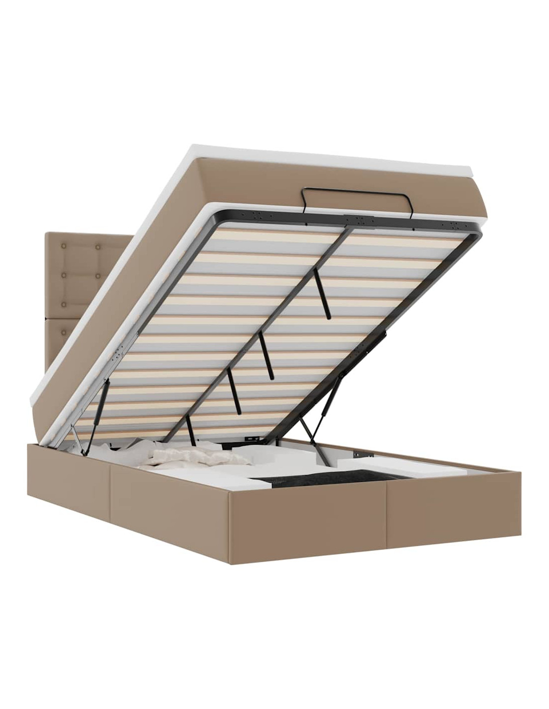 - Ampio vano portaoggetti sotto il letto: Grazie al meccanismo di sollevamento idraulico, il giroletto offre un ampio spazio sotto il letto, massimizzando lo spazio senza occupare ulteriore spazio sul pavimento. Con una semplice trazione della maniglia, la base a doghe si solleva dolcemente, permettendoti di recuperare i tuoi oggetti in modo rapido e senza sforzo.