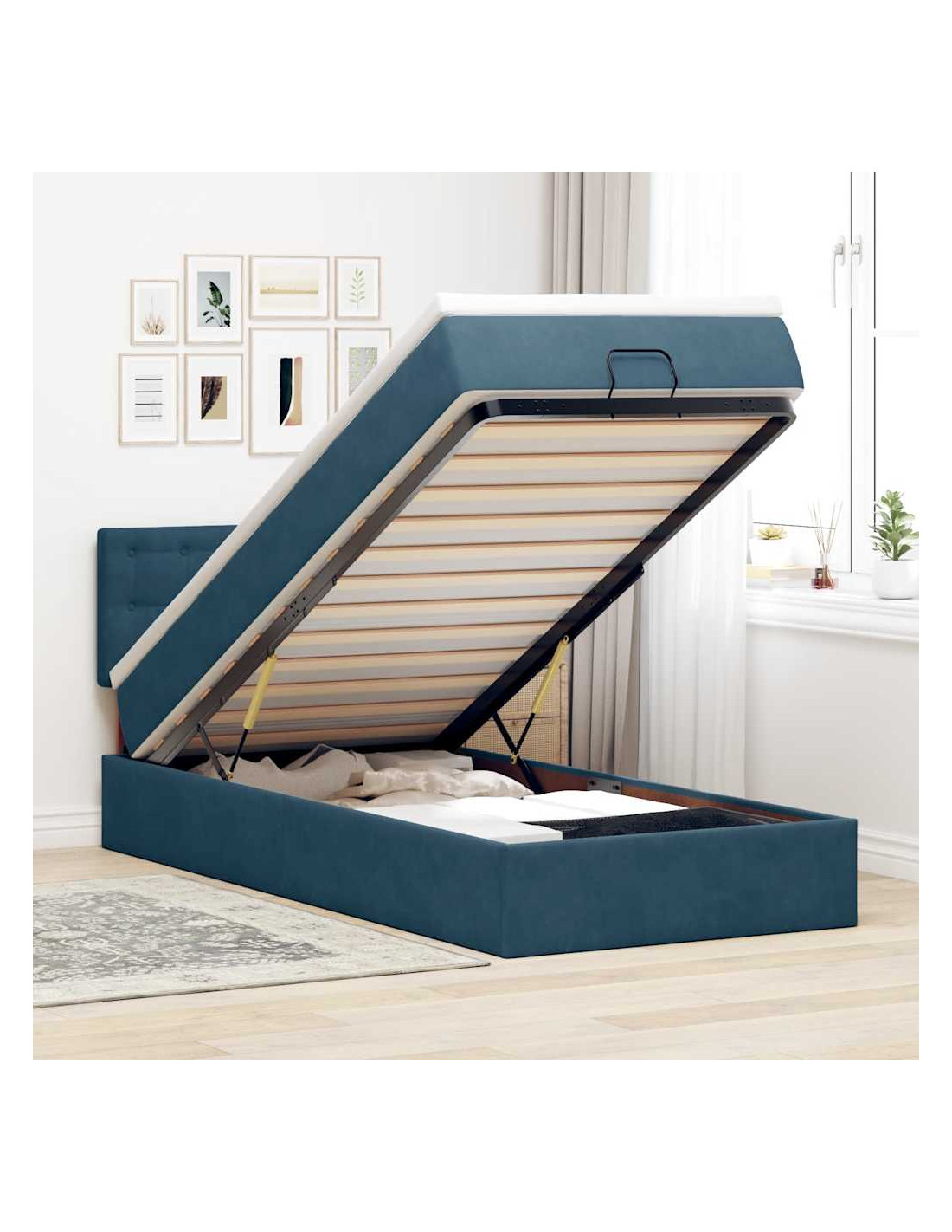 - Ampio vano portaoggetti sotto il letto: Grazie al meccanismo di sollevamento idraulico, il giroletto offre un ampio spazio sotto il letto, massimizzando lo spazio senza occupare ulteriore spazio sul pavimento. Con una semplice trazione della maniglia, la base a doghe si solleva dolcemente, permettendoti di recuperare i tuoi oggetti in modo rapido e senza sforzo.
