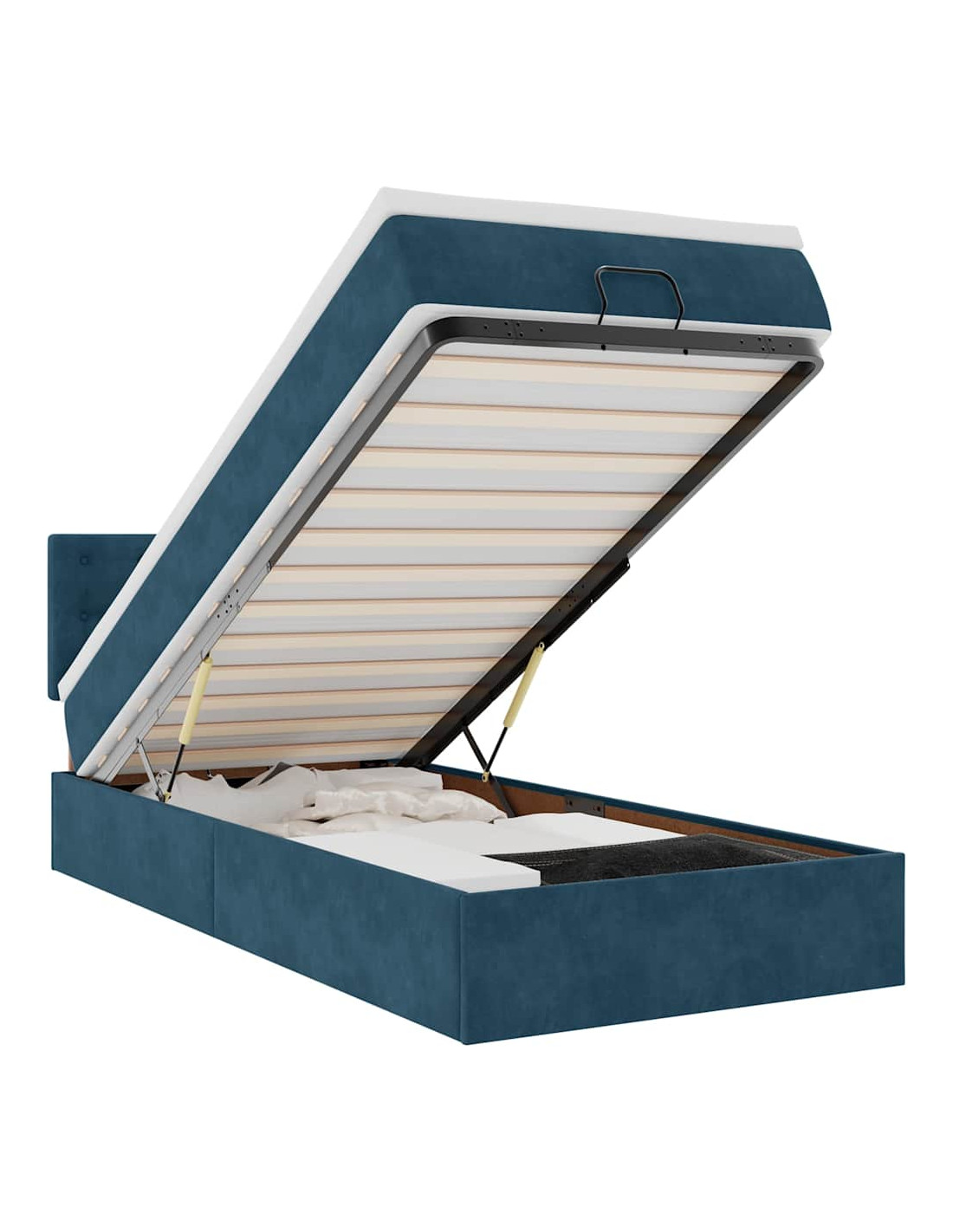 • Ampio vano portaoggetti sotto il letto: Grazie al meccanismo di sollevamento idraulico, il giroletto offre un ampio spazio sotto il letto, massimizzando lo spazio senza occupare ulteriore spazio sul pavimento. Con una semplice trazione della maniglia, la base a doghe si solleva dolcemente, permettendoti di recuperare i tuoi oggetti in modo rapido e senza sforzo.