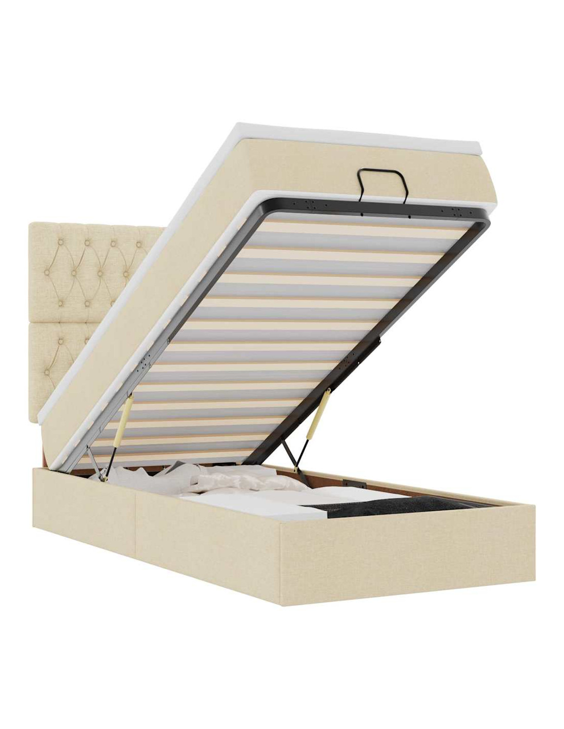 • Ampio vano portaoggetti sotto il letto: Grazie al meccanismo di sollevamento idraulico, il giroletto offre un ampio spazio sotto il letto, massimizzando lo spazio senza occupare ulteriore spazio sul pavimento. Con una semplice trazione della maniglia, la base a doghe si solleva dolcemente, permettendoti di recuperare i tuoi oggetti in modo rapido e senza sforzo.