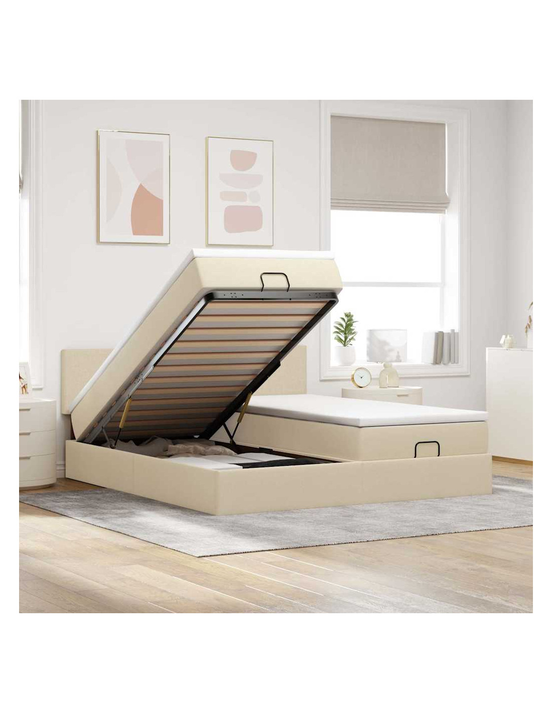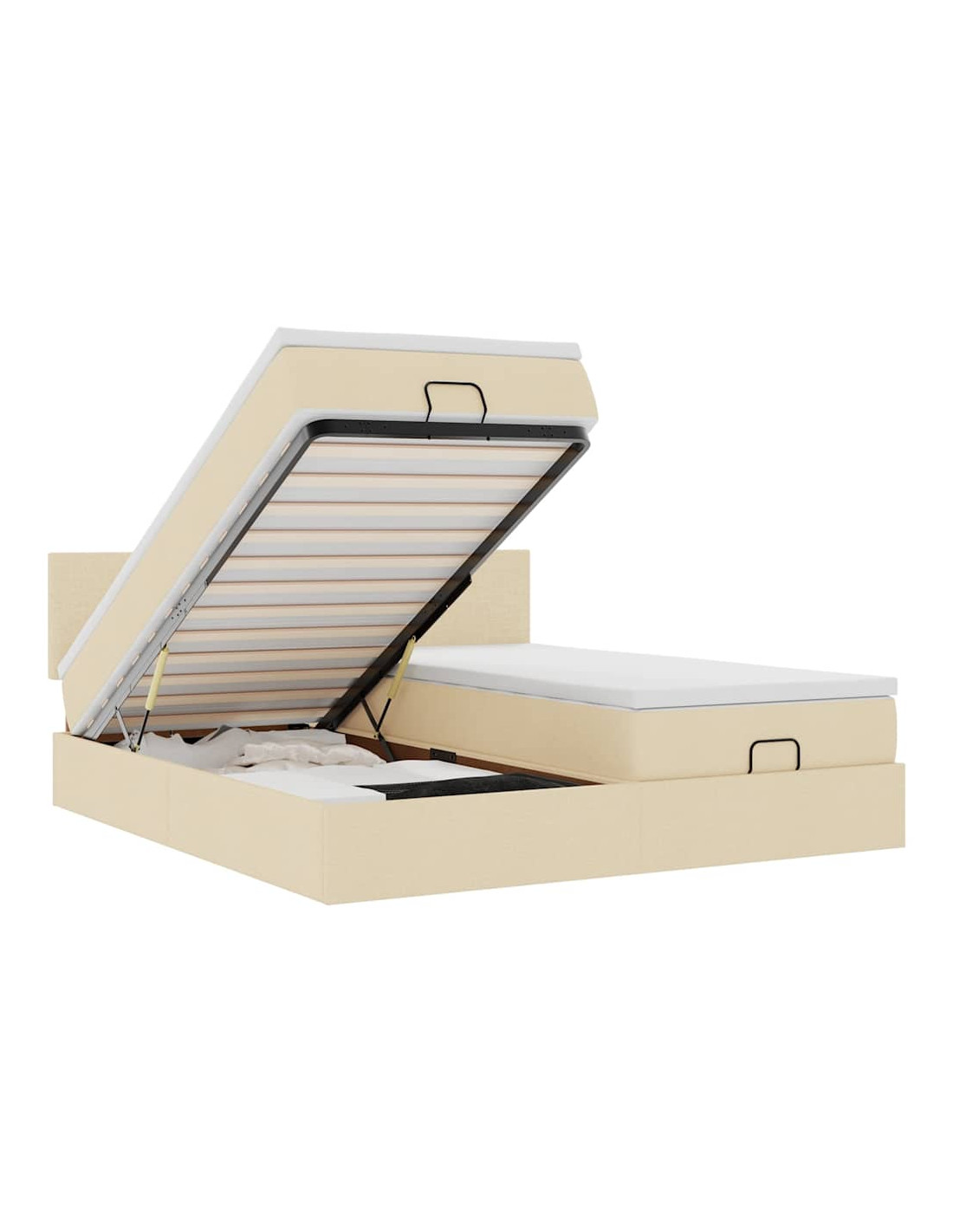 - Ampio vano portaoggetti sotto il letto: Grazie al meccanismo di sollevamento idraulico, il giroletto offre un ampio spazio sotto il letto, massimizzando lo spazio senza occupare ulteriore spazio sul pavimento. Con una semplice trazione della maniglia, la base a doghe si solleva dolcemente, permettendoti di recuperare i tuoi oggetti in modo rapido e senza sforzo.