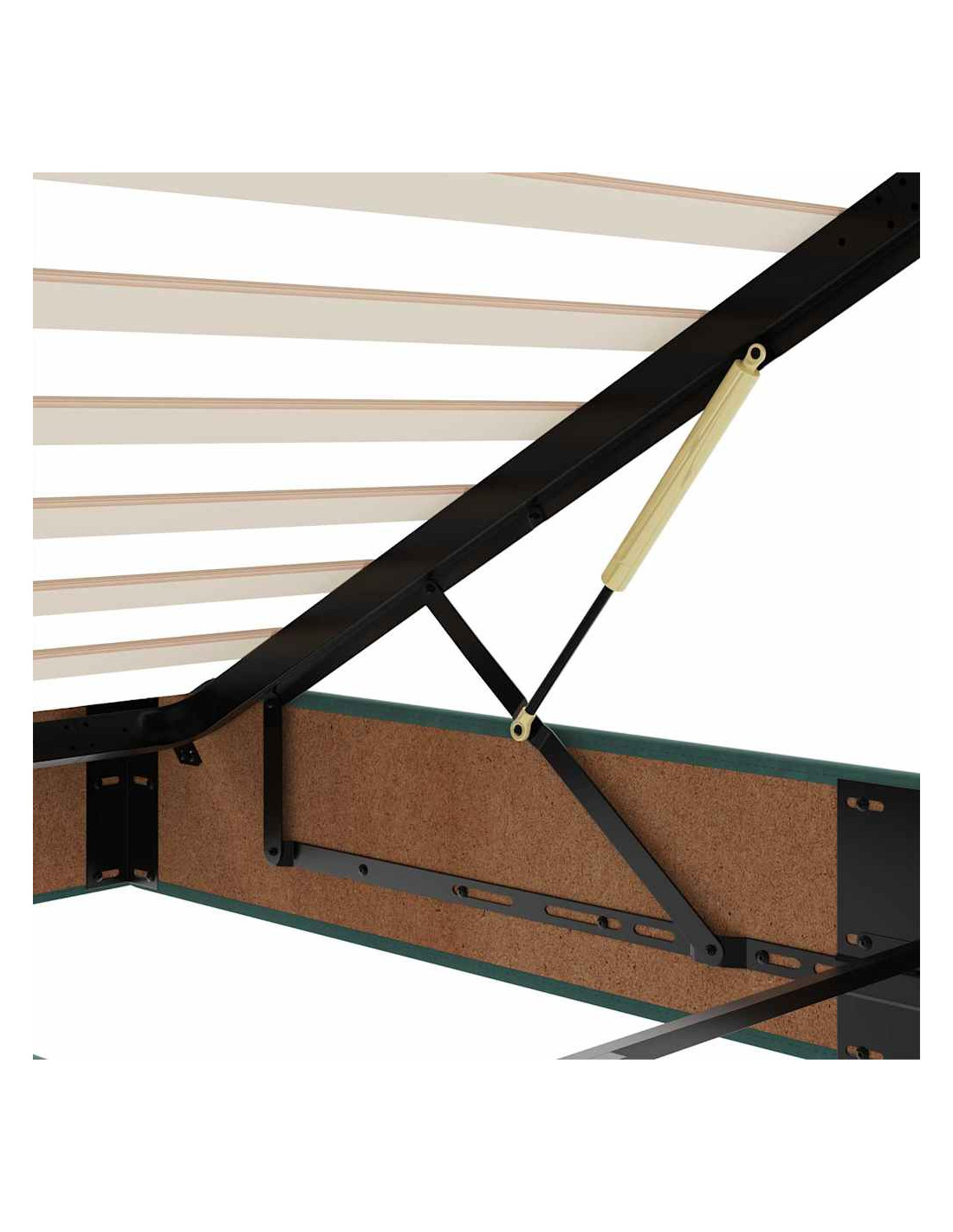 - Ampio vano portaoggetti sotto il letto: Grazie al meccanismo di sollevamento idraulico, il giroletto offre un ampio spazio sotto il letto, massimizzando lo spazio senza occupare ulteriore spazio sul pavimento. Con una semplice trazione della maniglia, la base a doghe si solleva dolcemente, permettendoti di recuperare i tuoi oggetti in modo rapido e senza sforzo.