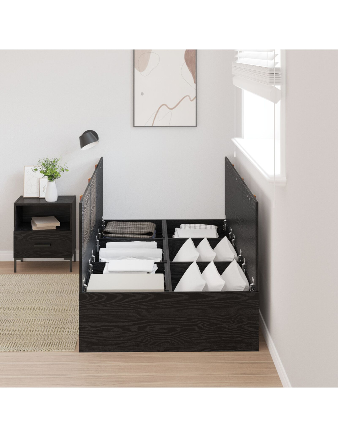 Questa struttura letto moderna unisce estetica e funzionalità, perfetta per una camera da letto contemporanea. Il suo stile elegante, con linee pulite e superfici lisce, si integra facilmente con vari stili di decorazione e diventa un punto focale ma pratico nel tuo spazio notte. Il letto ha uno stoccaggio nascosto, ideale per tenere tutto in ordine e mantenere l’atmosfera della camera tranquilla, perfetto per appartamenti piccoli o camere per gli ospiti.