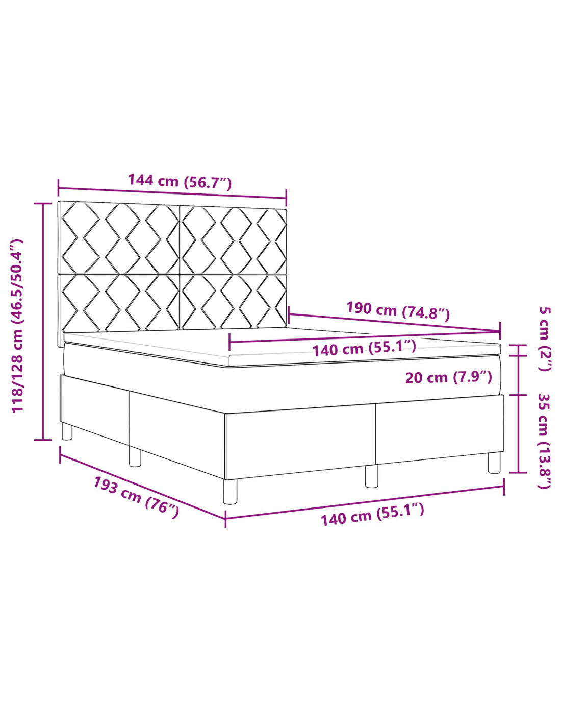 - Dimensione materasso: Matrimoniale corto (140 cm x 190 cm / 55" x 75")