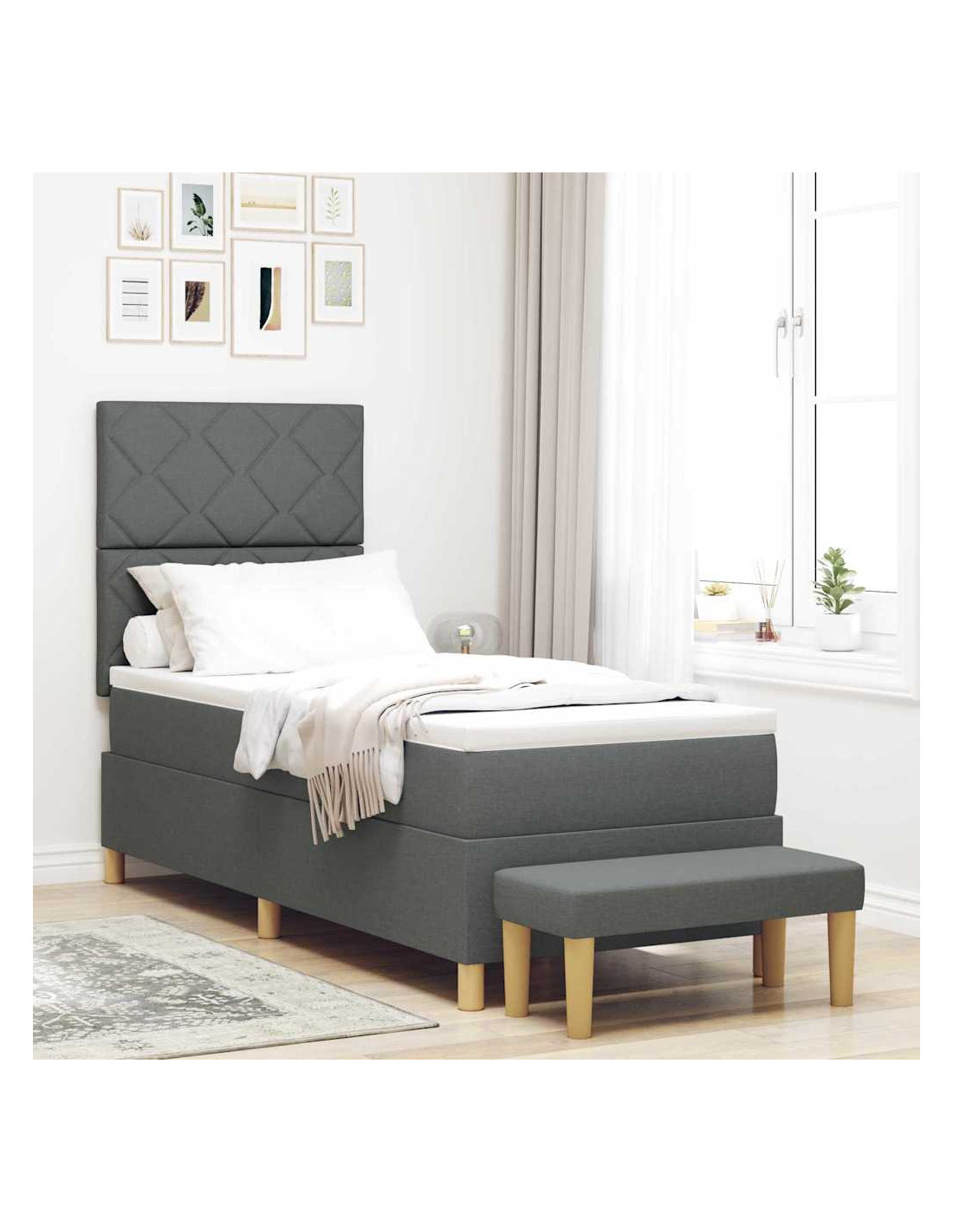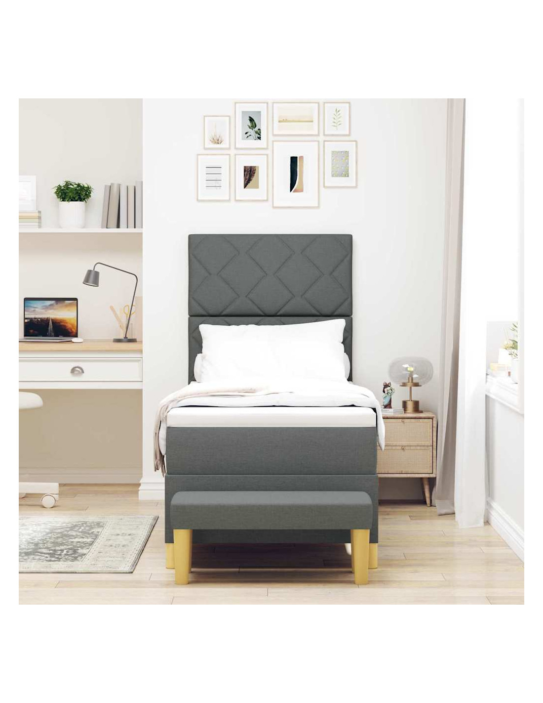 - Componenti Inclusi: Prendi tutto ciò che ti serve per dormire: un robusto telaio del letto, una testata imbottita in poliestere, un materasso in schiuma medio-rigido e una panca utile. Ogni pezzo contribuisce a una fantastica esperienza di sonno.