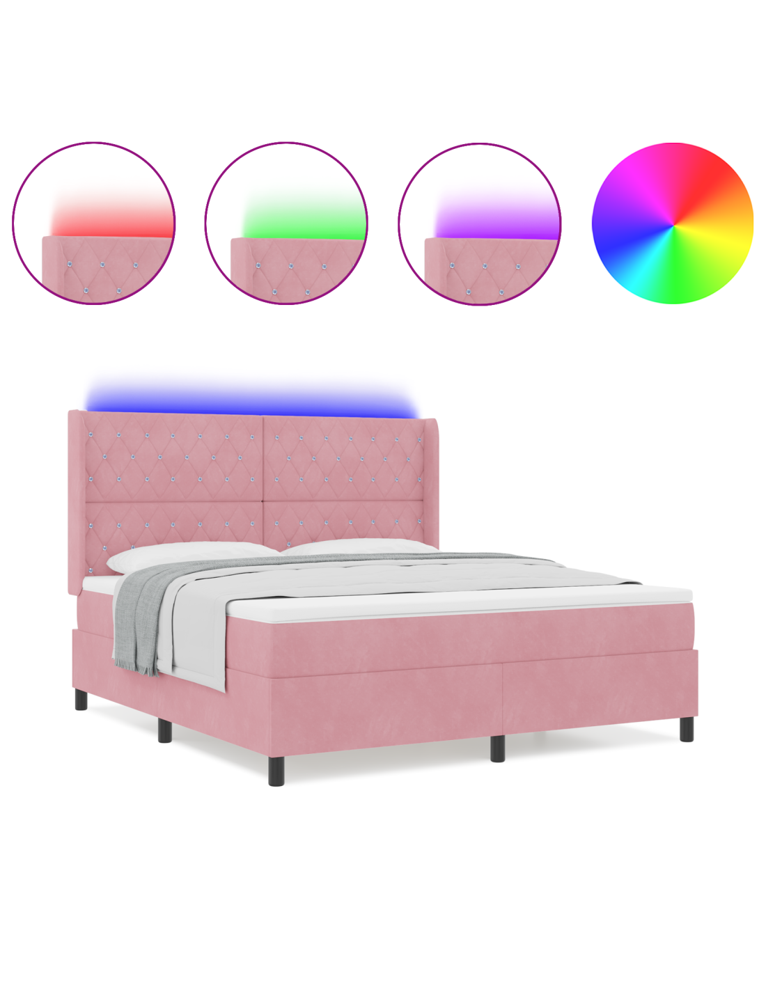 Un'idea moderna per chi cerca eleganza e funzionalità, il letto box spring con luci LED rende il tuo spazio unico grazie al suo design contemporaneo e all'illuminazione colorata. La finitura in velluto, insieme ai dettagli in legno ingegnerizzato, trasmette un senso di lusso, facendo di questo letto un pezzo d'arredo straordinario per ogni stanza. Le luci LED multicolori permettono di creare l'atmosfera giusta secondo le tue esigenze, rendendo l'ambiente perfetto per il relax.