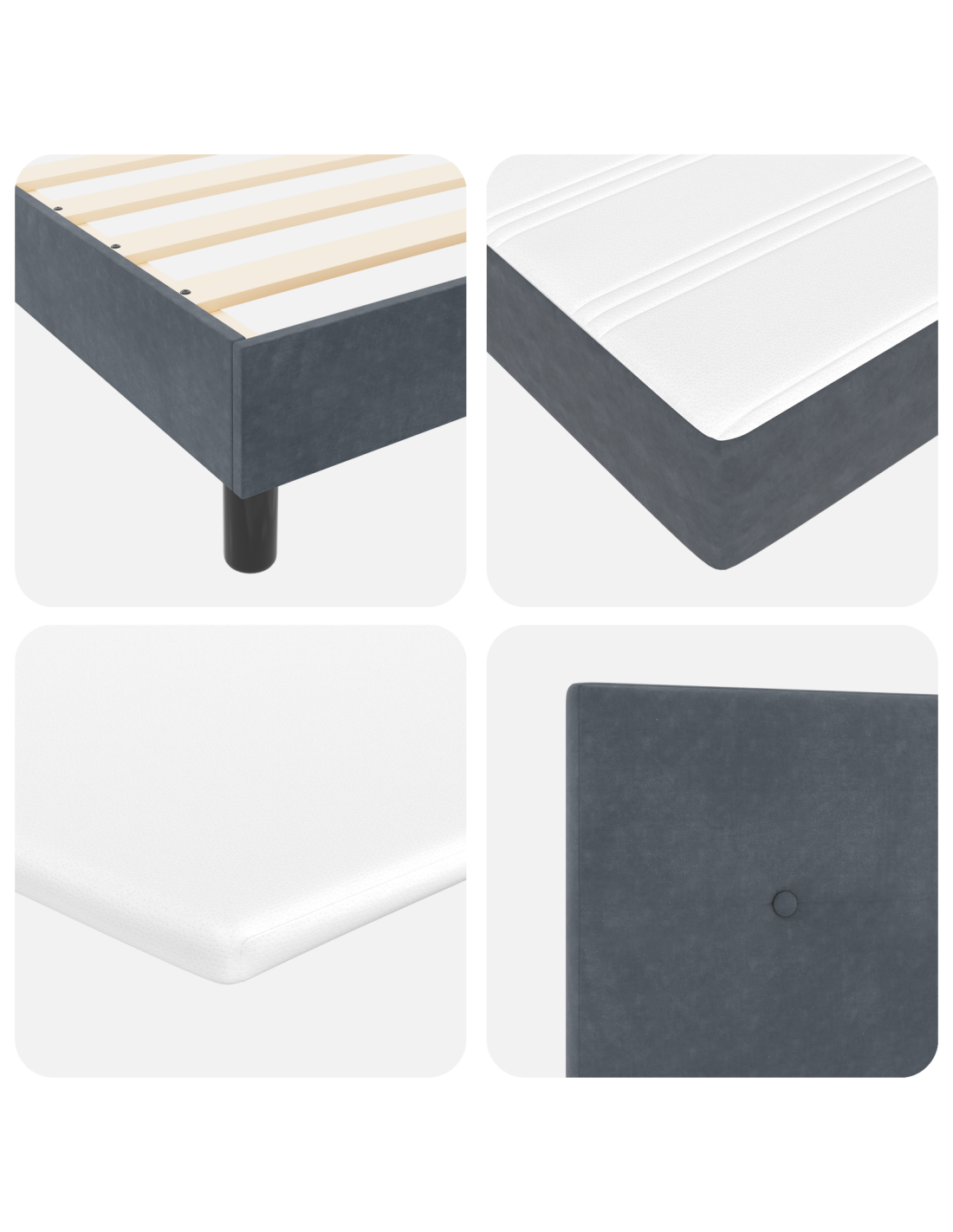 - Materiali: Il letto è realizzato con una solida struttura in legno ingegnerizzato rivestita in velluto lussuoso, che gli conferisce uno stile morbido e attraente. La sua robustezza garantisce un supporto duraturo, mentre il velluto aggiunge un tocco di eleganza all'estetica della tua camera.