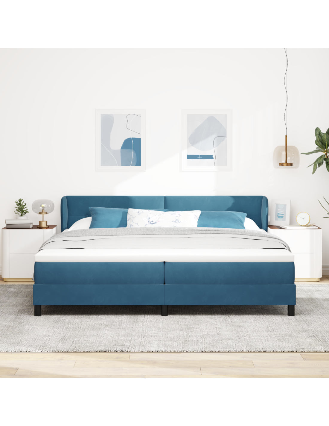 - Materiali: Il letto è realizzato con una solida struttura in legno ingegnerizzato rivestita in velluto lussuoso, che gli conferisce uno stile morbido e attraente. La sua robustezza garantisce un supporto duraturo, mentre il velluto aggiunge un tocco di eleganza all'estetica della tua camera.
