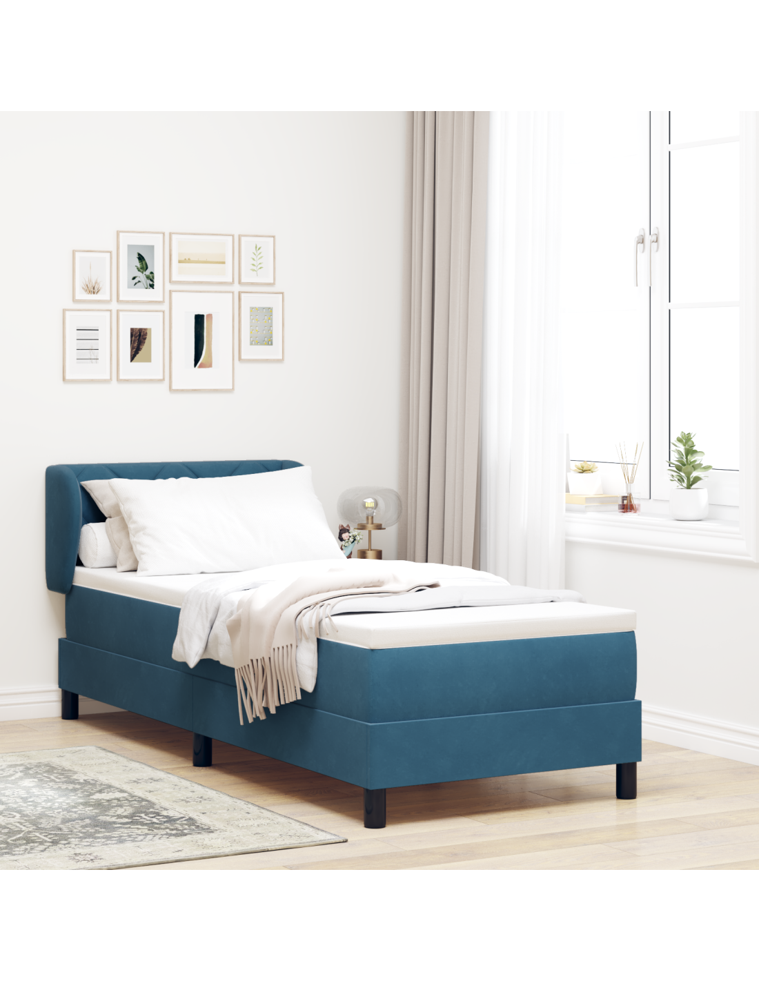 - Materiali: Il letto è realizzato con una solida struttura in legno ingegnerizzato rivestita in velluto lussuoso, che gli conferisce uno stile morbido e attraente. La sua robustezza garantisce un supporto duraturo, mentre il velluto aggiunge un tocco di eleganza all'estetica della tua camera.