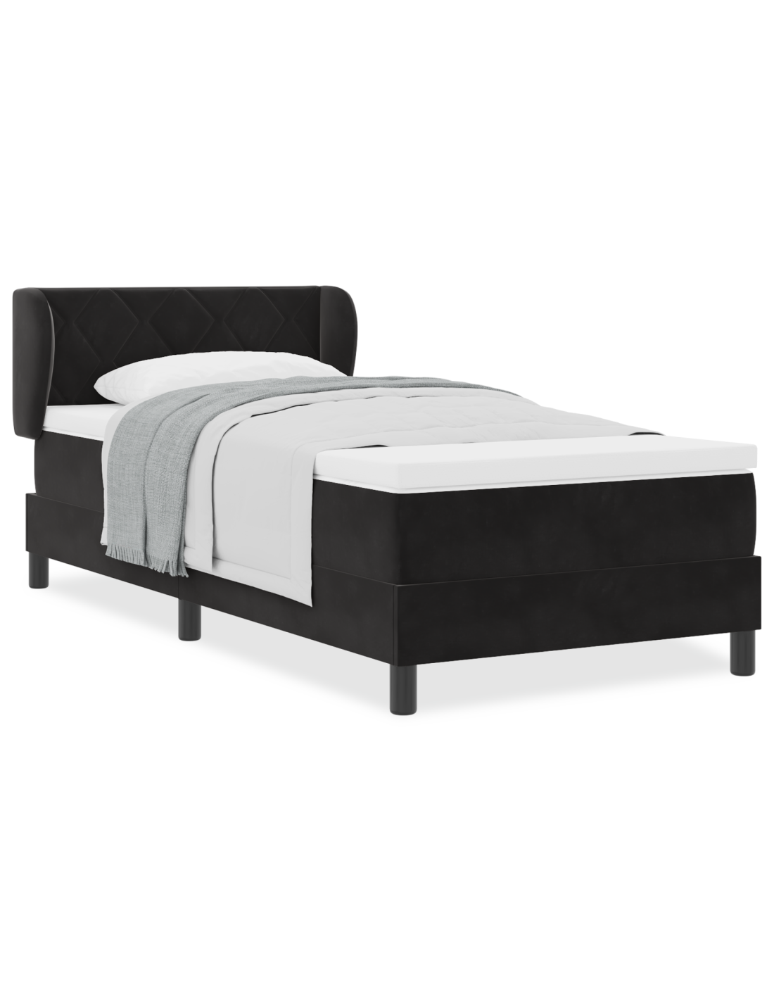 - Componenti Inclusi: Il letto viene fornito con un materasso e un topper per un comfort eccezionale. La testiera, fatta in schiuma e legno massello di pino, fornisce supporto extra per collo e schiena. Le gambe in plastica nera danno stabilità e si abbinano al look moderno.