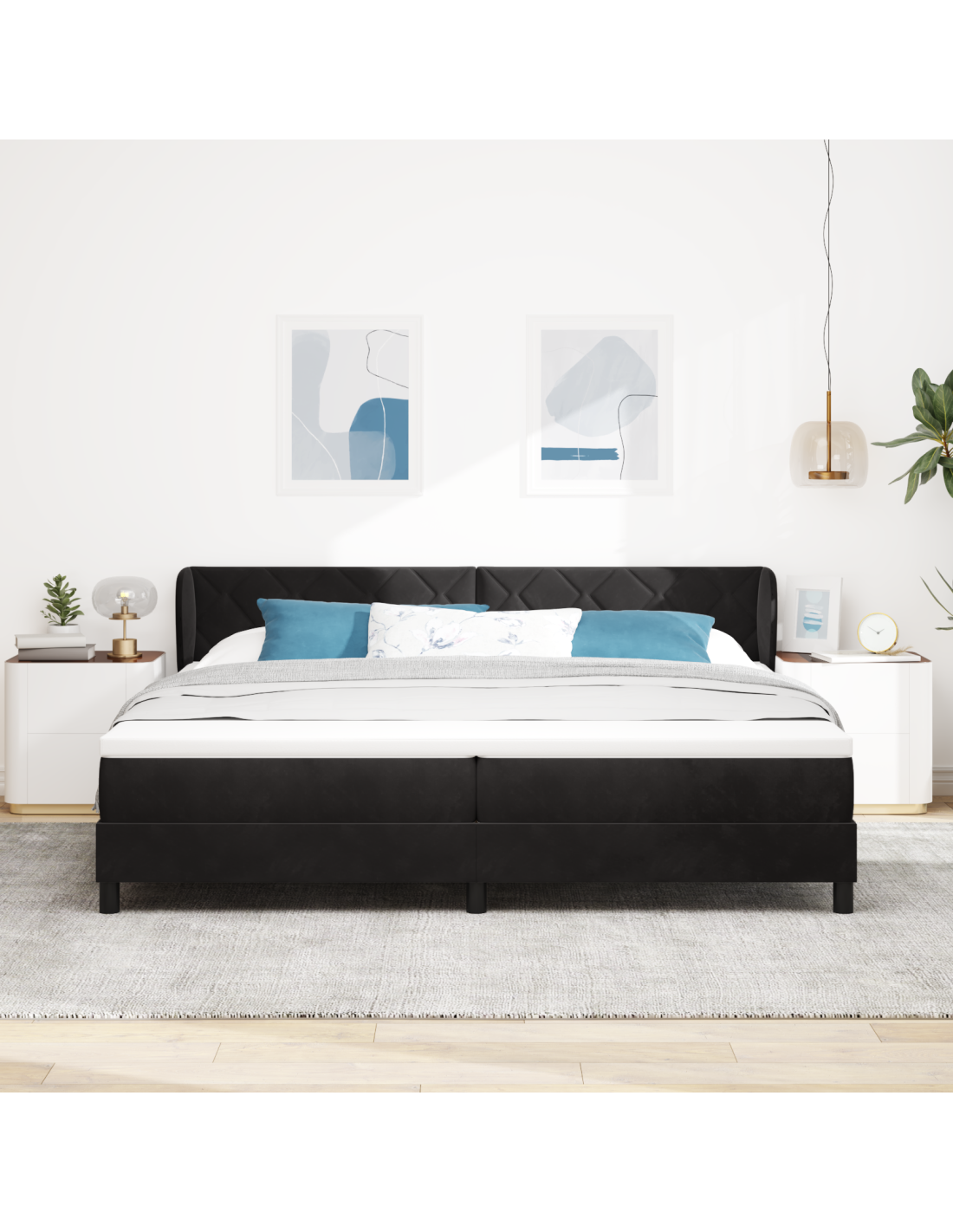 - Materiali: Il letto è realizzato con una solida struttura in legno ingegnerizzato rivestita in velluto lussuoso, che gli conferisce uno stile morbido e attraente. La sua robustezza garantisce un supporto duraturo, mentre il velluto aggiunge un tocco di eleganza all'estetica della tua camera.