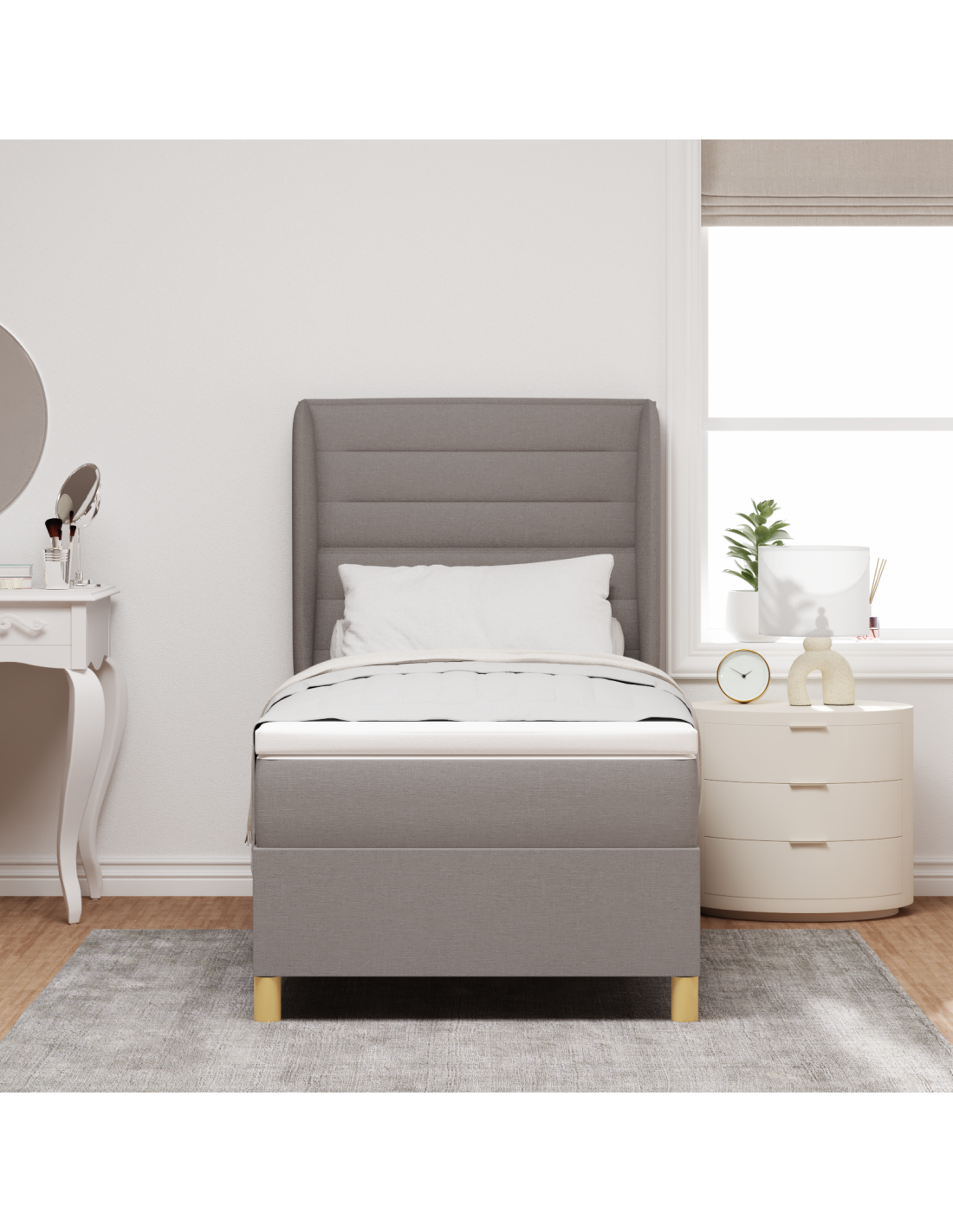 - Elementi Estetici: Ricoperto in un tessuto di alta qualità, il letto appare accogliente e raffinato. La trama intrecciata lo rende interessante, assicurando che si adatti bene a ogni stile di camera, dal minimalista al tradizionale.