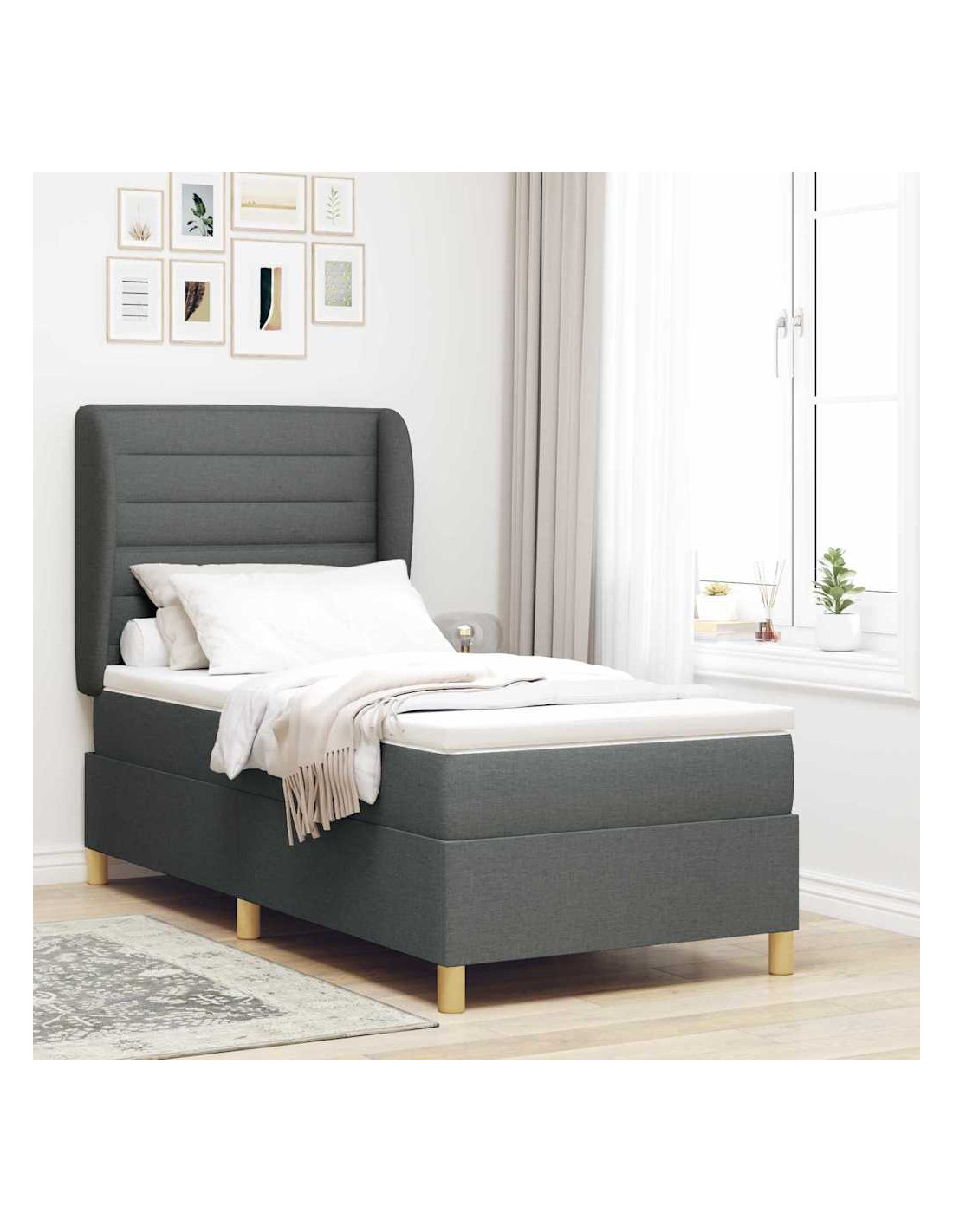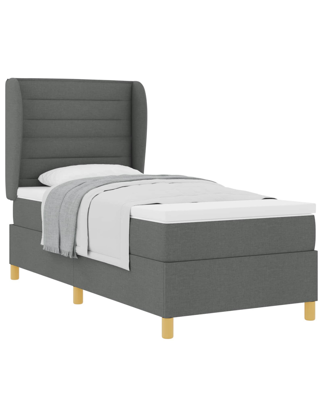 Il letto con molle e materasso in tessuto grigio scuro è dove lo stile moderno incontra la praticità. È un pezzo unico per qualsiasi camera da letto, con linee pulite e un look semplice. È un grande mix di comfort e robustezza, perfetto per tutti.