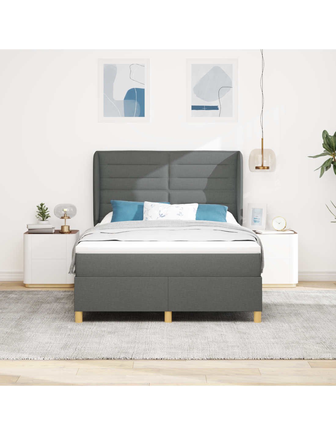 Il letto con molle e materasso in tessuto grigio scuro è dove lo stile moderno incontra la praticità. È un pezzo unico per qualsiasi camera da letto, con linee pulite e un look semplice. È un grande mix di comfort e robustezza, perfetto per tutti.