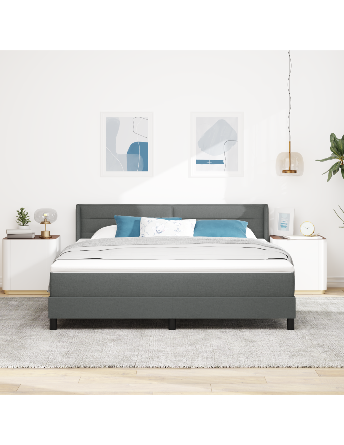 Il letto box spring moderno ha un design elegante che si integra perfettamente nell'arredamento contemporaneo, ideale per chi cerca funzionalità e bellezza. Pensato per essere semplice, questo letto diventa il fulcro della stanza, unendo comfort e stile. I dettagli curati - dalla testiera progettata con cura al materasso supportante - creano uno spazio perfetto per un sonno riposante e una vita raffinata.