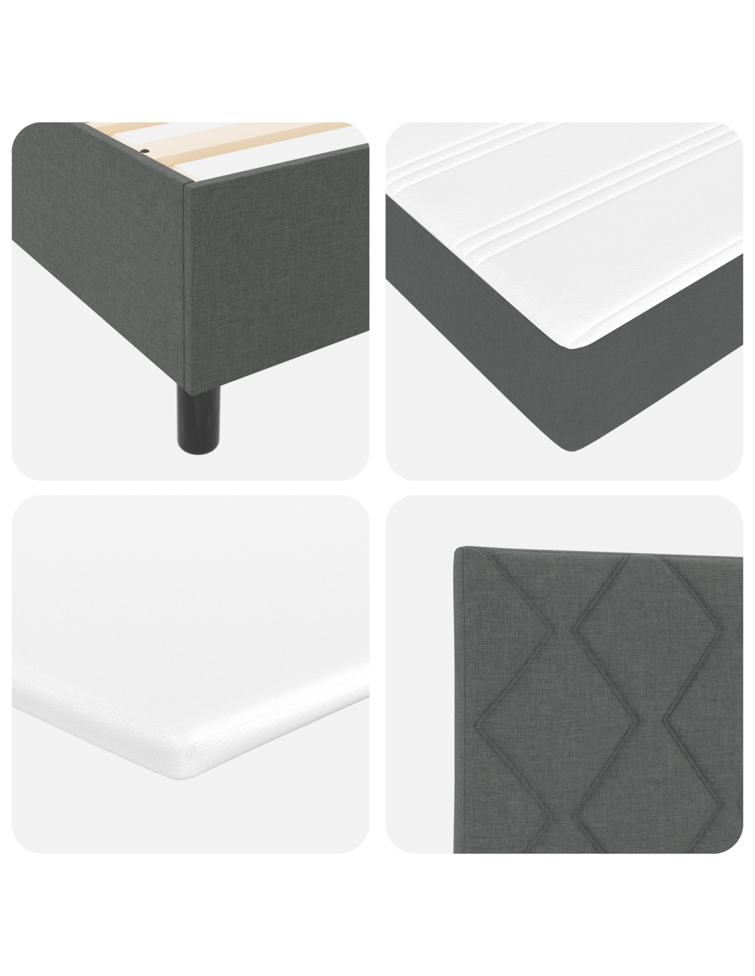 - Materiali di Qualità: Il letto è realizzato in poliestere resistente, garantendo una superficie robusta ma confortevole che resiste all'uso quotidiano. Il legno ingegnerizzato fornisce una struttura del telaio robusta, assicurando che rimanga un elemento fondamentale nella tua camera da letto per anni. La sua texture in tessuto completa lo stile contemporaneo, migliorando comfort e appeal estetico.