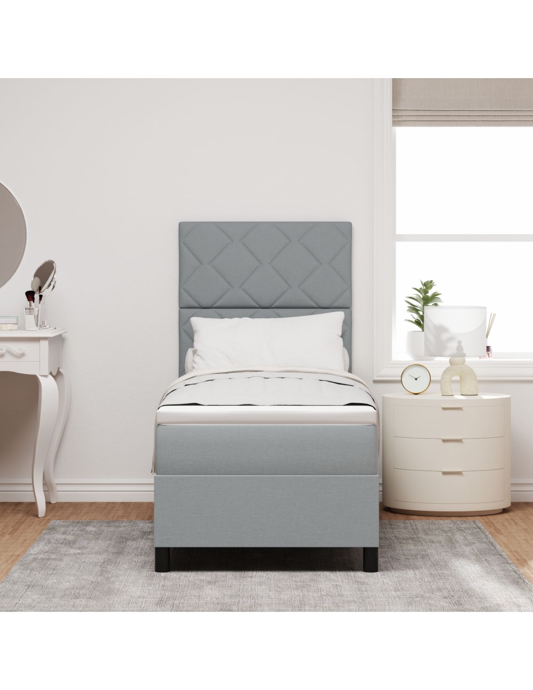 Questo letto box spring colpisce per il suo aspetto e per la funzionalità, ed è un'ottima scelta per le camere moderne. Con le sue linee pulite e uno stile semplice, diventa un punto focale in qualsiasi ambiente. È progettato per soddisfare tutte le tue esigenze, offrendo una sensazione di medio-durezza con il suo materasso a molle insacchettate e garantendo comfort indipendentemente dalla tua posizione durante il sonno. Inoltre, la testiera regolabile si adatta facilmente a diversi spessori del materasso. Che tu stia dormendo o semplicemente rilassandoti, questo letto è tutto incentrato su comfort e praticità.