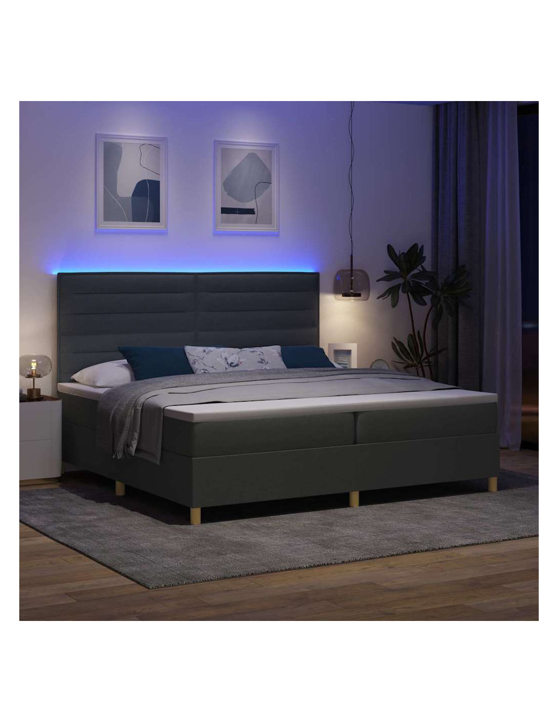 - Illuminazione LED: Rendi speciale il tuo spazio notte con le strisce RGB LED dietro la testiera. Con luci regolabili, creano un'atmosfera rilassata per ogni occasione, rendendo questa caratteristica sia bella che utile.