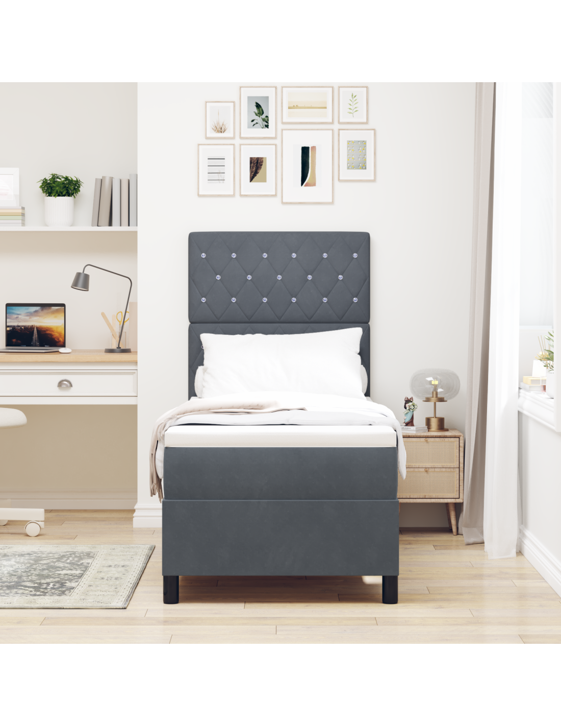 - Costruzione di qualità: Il letto è realizzato con tessuti di alta qualità e legno ingegnerizzato, offrendo stabilità e comfort. I materiali lavorano insieme per creare un luogo di riposo robusto e accogliente.