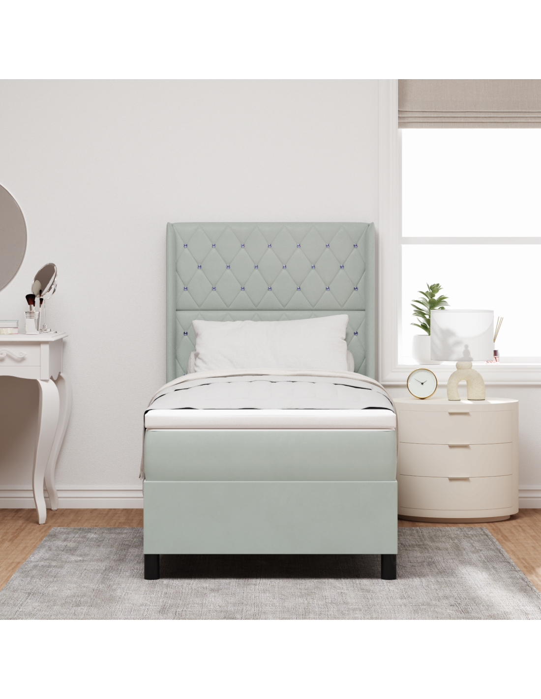 Un'idea moderna per chi cerca eleganza e funzionalità, il letto box spring con luci LED rende il tuo spazio unico grazie al suo design contemporaneo e all'illuminazione colorata. La finitura in velluto, insieme ai dettagli in legno ingegnerizzato, trasmette un senso di lusso, facendo di questo letto un pezzo d'arredo straordinario per ogni stanza. Le luci LED multicolori permettono di creare l'atmosfera giusta secondo le tue esigenze, rendendo l'ambiente perfetto per il relax.
