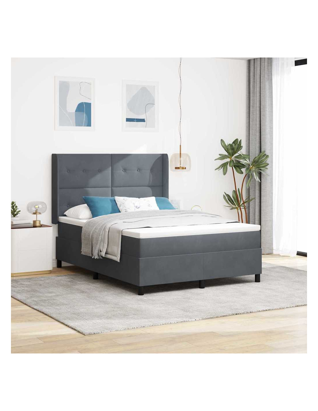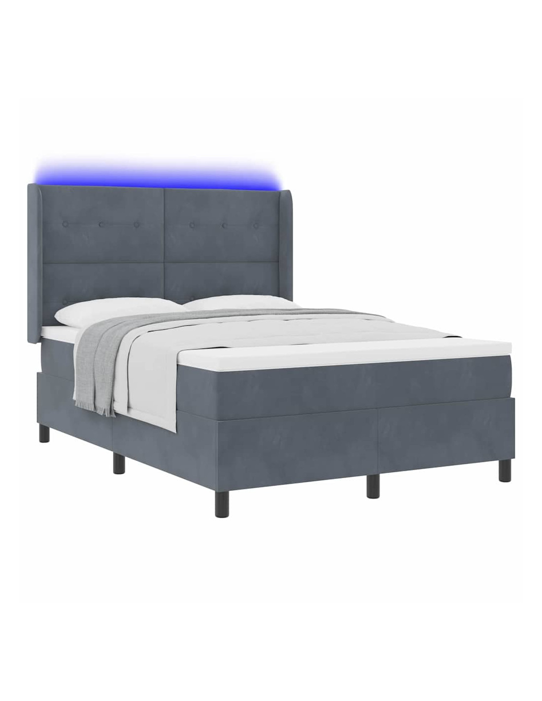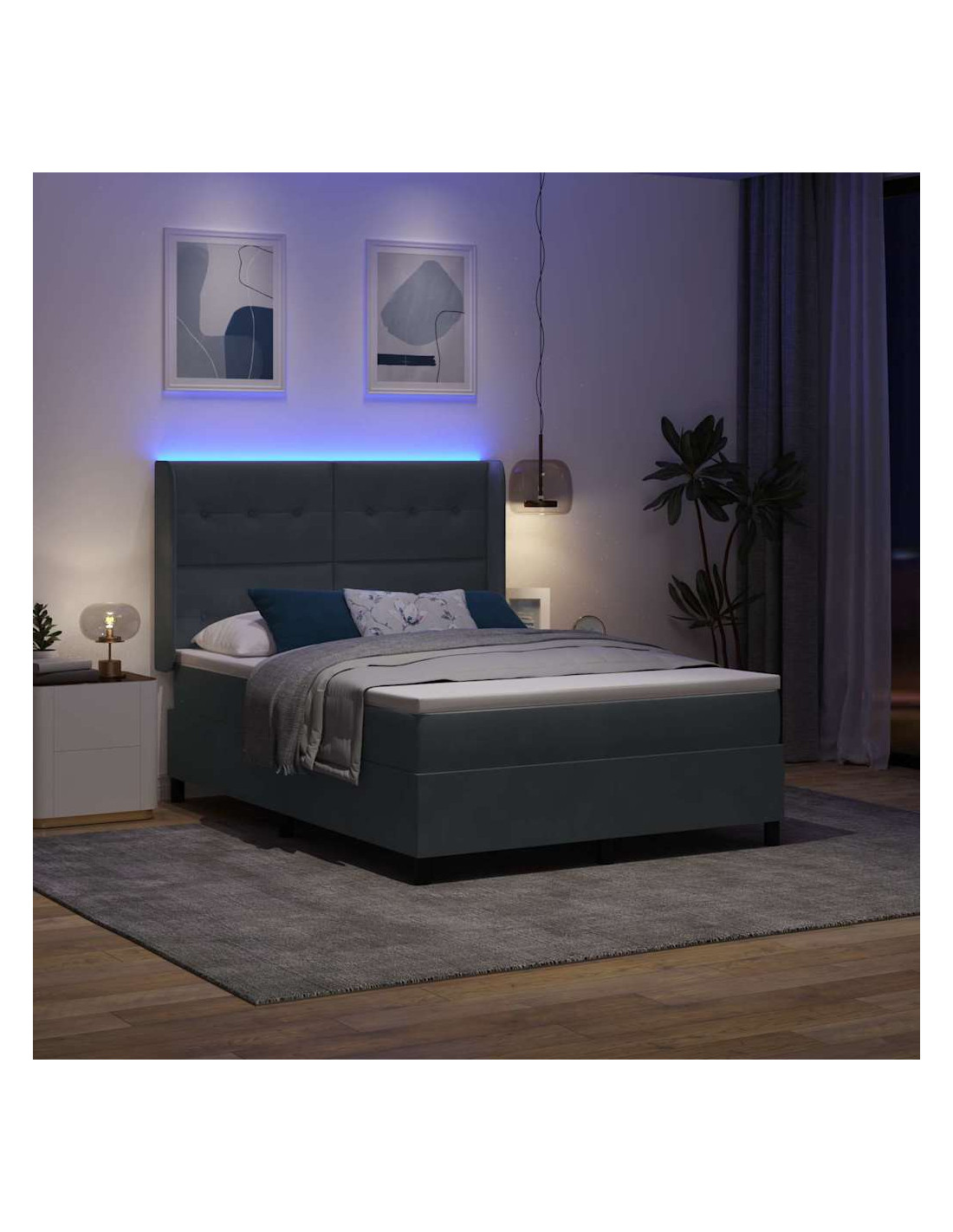 Un'idea moderna per chi cerca eleganza e funzionalità, il letto box spring con luci LED rende il tuo spazio unico grazie al suo design contemporaneo e all'illuminazione colorata. La finitura in velluto, insieme ai dettagli in legno ingegnerizzato, trasmette un senso di lusso, facendo di questo letto un pezzo d'arredo straordinario per ogni stanza. Le luci LED multicolori permettono di creare l'atmosfera giusta secondo le tue esigenze, rendendo l'ambiente perfetto per il relax.