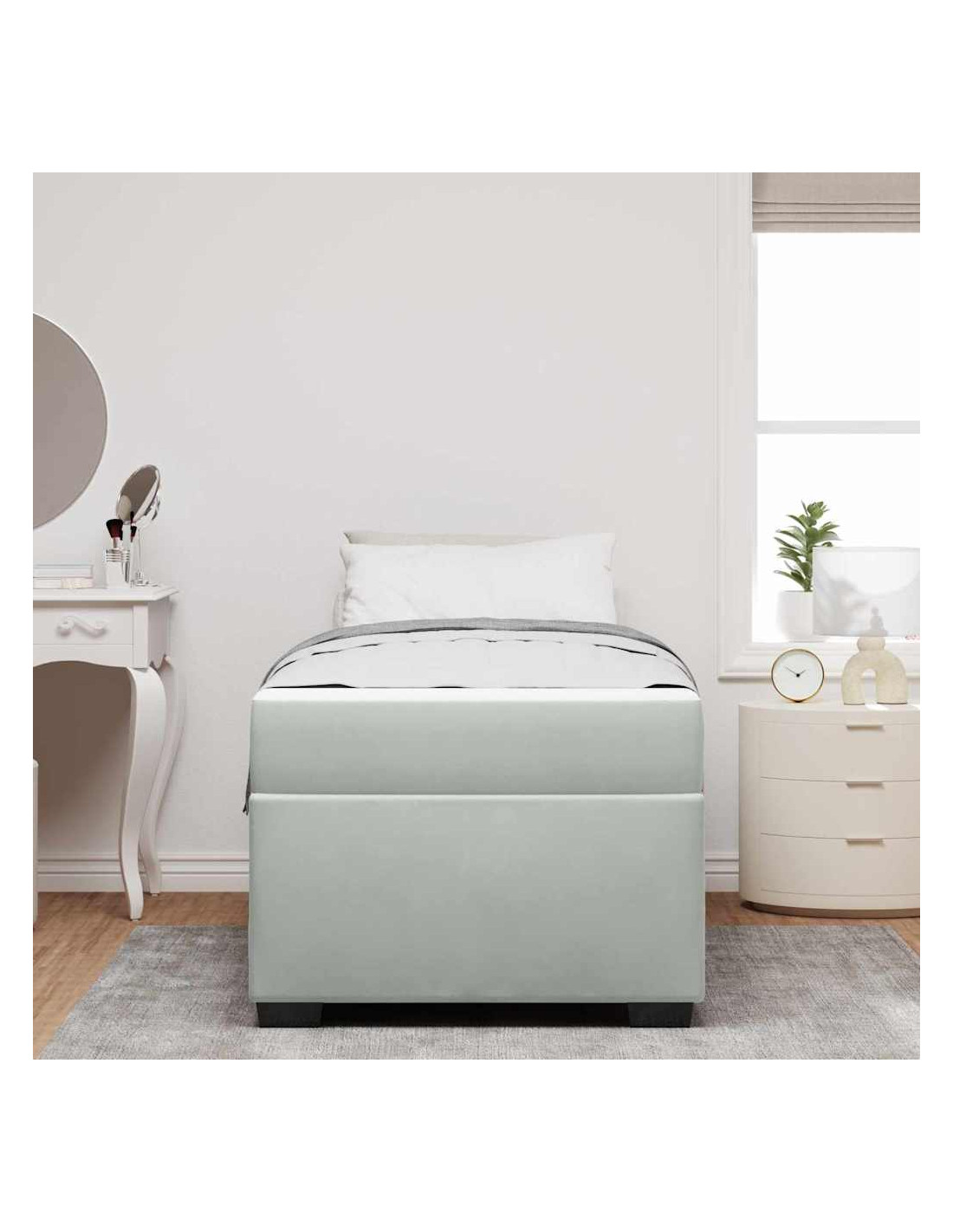 Questo letto in velluto con materasso è tutto sullo stile e il comfort, perfetto per chi cerca una soluzione elegante e funzionale. Con la sua forma rettangolare e il contrasto bianco e nero, è facile da abbinare a qualsiasi decorazione della camera da letto. Il design è semplice e le linee pulite creano un'atmosfera accogliente, ideale per notti di riposo e mattine pigre.
