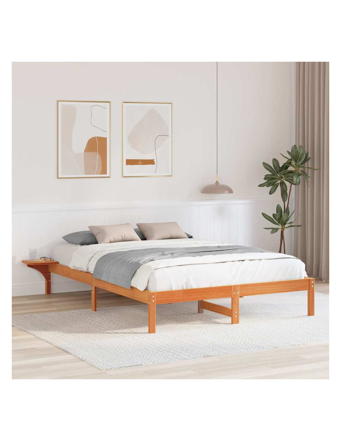 Questa struttura moderna per letto è un tocco unico in qualsiasi camera, con uno stile semplice e pratico. Creata per unire estetica e funzionalità, ha linee pulite che si uniscono in angoli retti, perfetta per loft o case contemporanee. Con robusti elementi in legno massello di pino, offre una struttura solida e affidabile, adatta a vari stili d'interni.