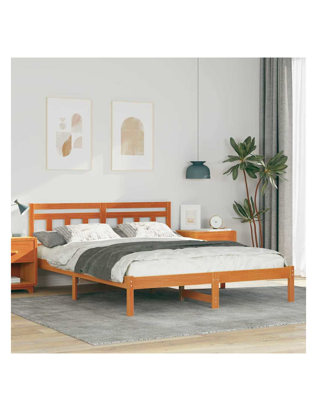 - Costruzione in legno massello di pino: Il letto, la testiera e le gambe sono fatti di legno massello di pino di alta qualità. Questa scelta garantisce robustezza e un aspetto elegante, creando una struttura stabile che resiste all'usura.