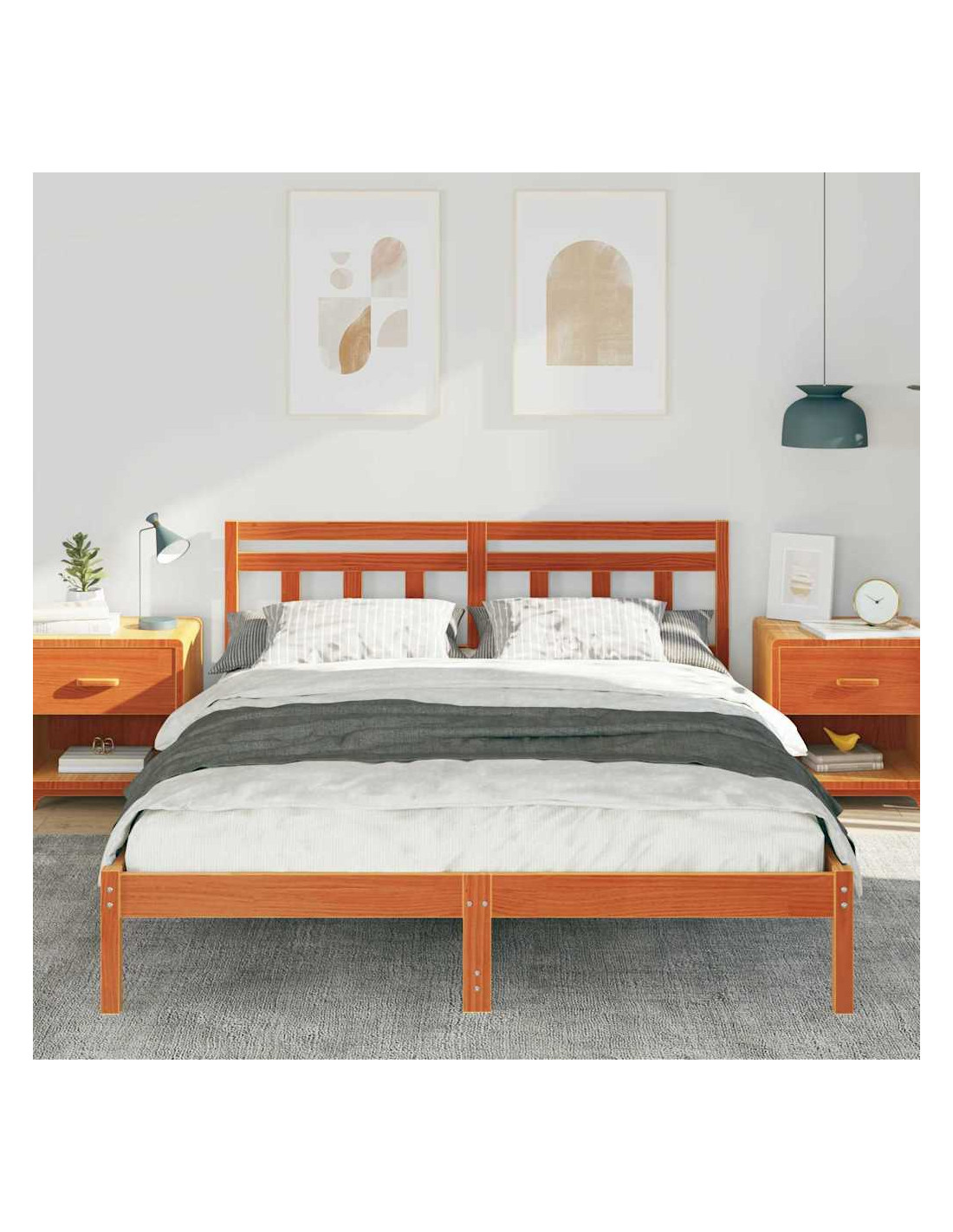 - Costruzione in legno massello di pino: Il letto, la testiera e le gambe sono fatti di legno massello di pino di alta qualità. Questa scelta garantisce robustezza e un aspetto elegante, creando una struttura stabile che resiste all'usura.