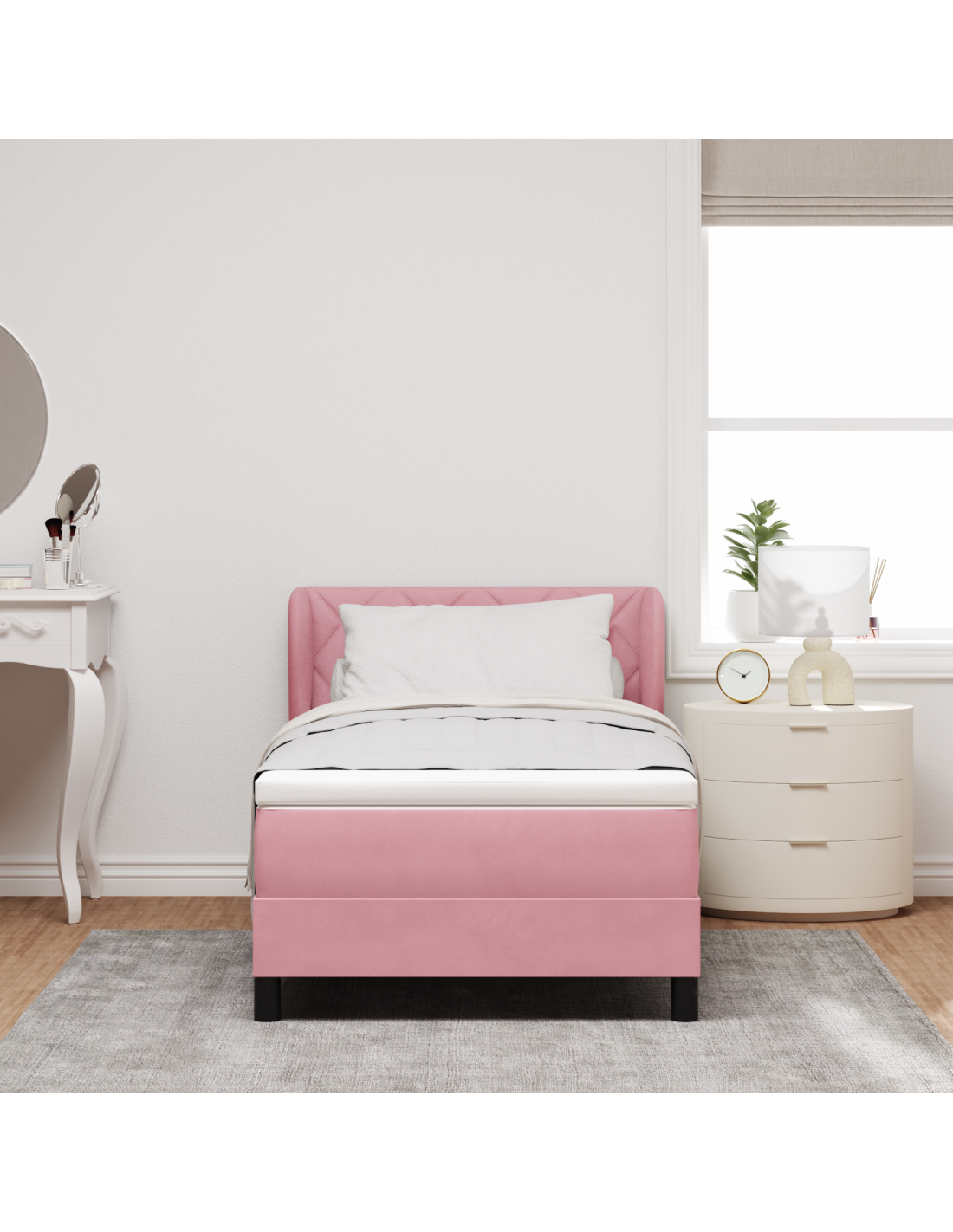 - Materiali: Il letto è realizzato con una solida struttura in legno ingegnerizzato rivestita in velluto lussuoso, che gli conferisce uno stile morbido e attraente. La sua robustezza garantisce un supporto duraturo, mentre il velluto aggiunge un tocco di eleganza all'estetica della tua camera.