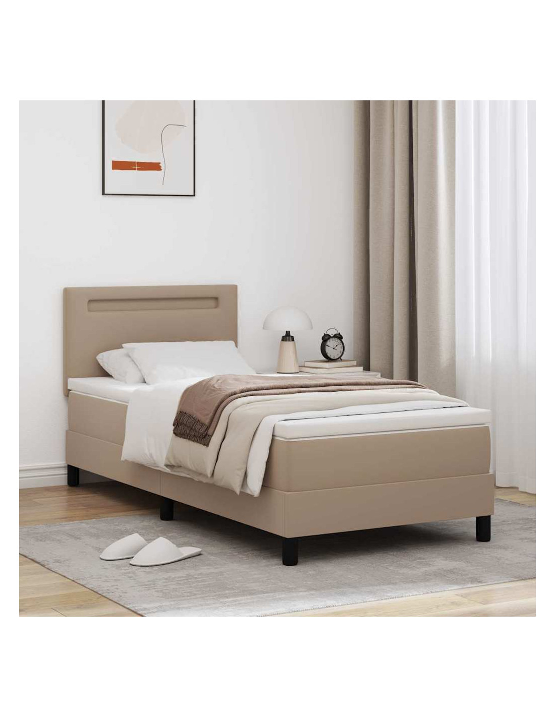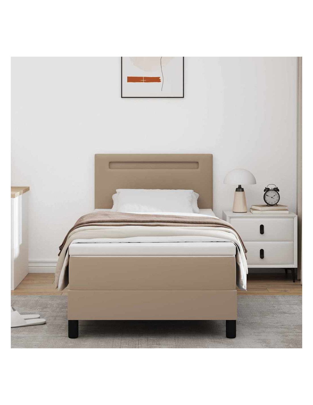 - Materiali: Il letto è realizzato con una combinazione di pelle sintetica e legno ingegnerizzato, bilanciando estetica e robustezza. La finitura in pelle sintetica aggiunge un tocco di lusso, rendendo più vivace l’ambiente di qualsiasi stanza. Il legno ingegnerizzato assicura un telaio robusto, garantendo durata nel tempo.