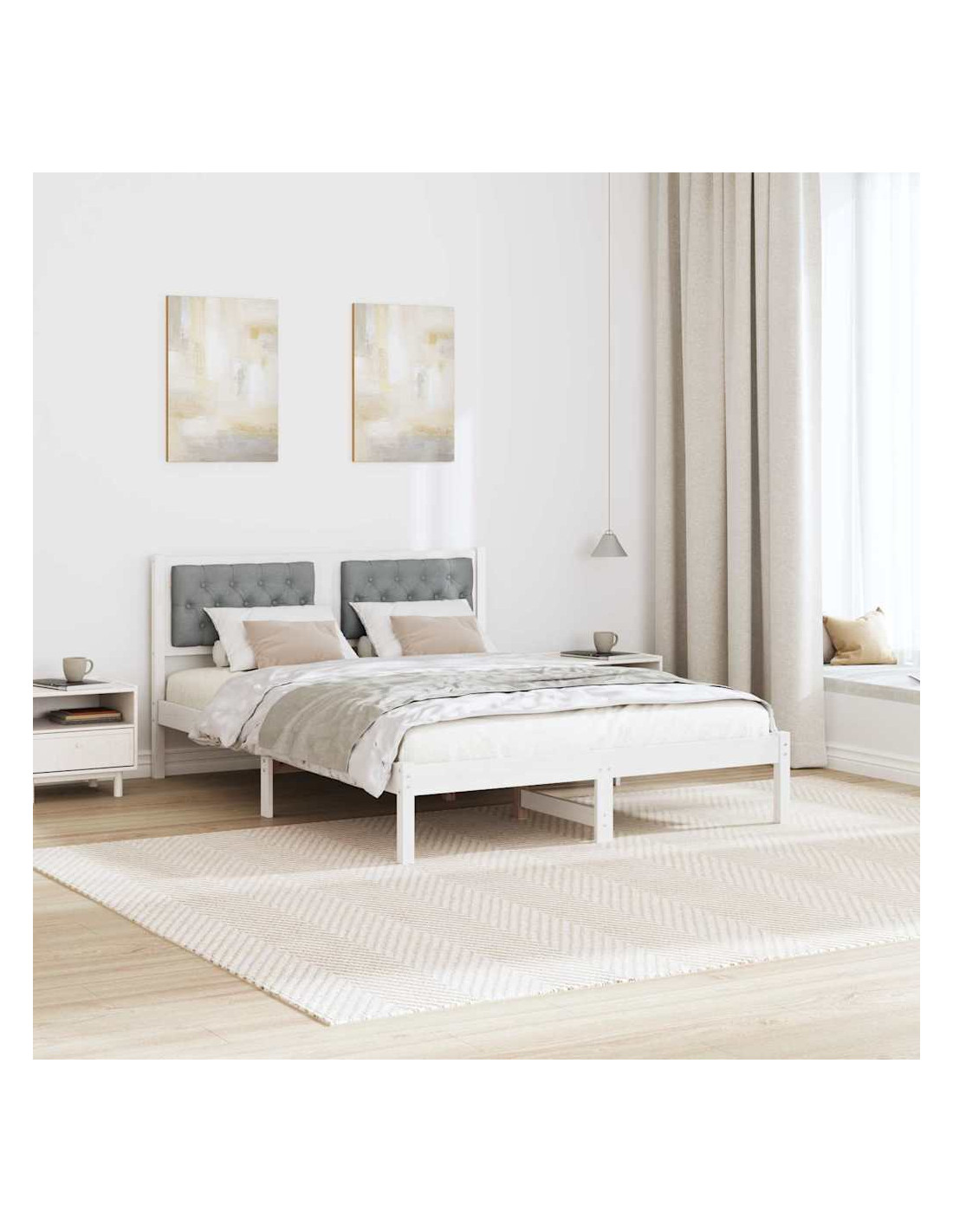 - Costruzione in pino massello Questo letto è fatto di legno massello di pino, noto per la sua durabilità e il suo fascino senza tempo. È resistente e contribuisce a un'atmosfera naturale e calda, migliorando il comfort della camera.