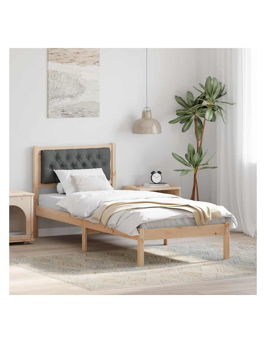 - Costruzione in pino massello Questo letto è fatto di legno massello di pino, noto per la sua durabilità e il suo fascino senza tempo. È resistente e contribuisce a un'atmosfera naturale e calda, migliorando il comfort della camera.