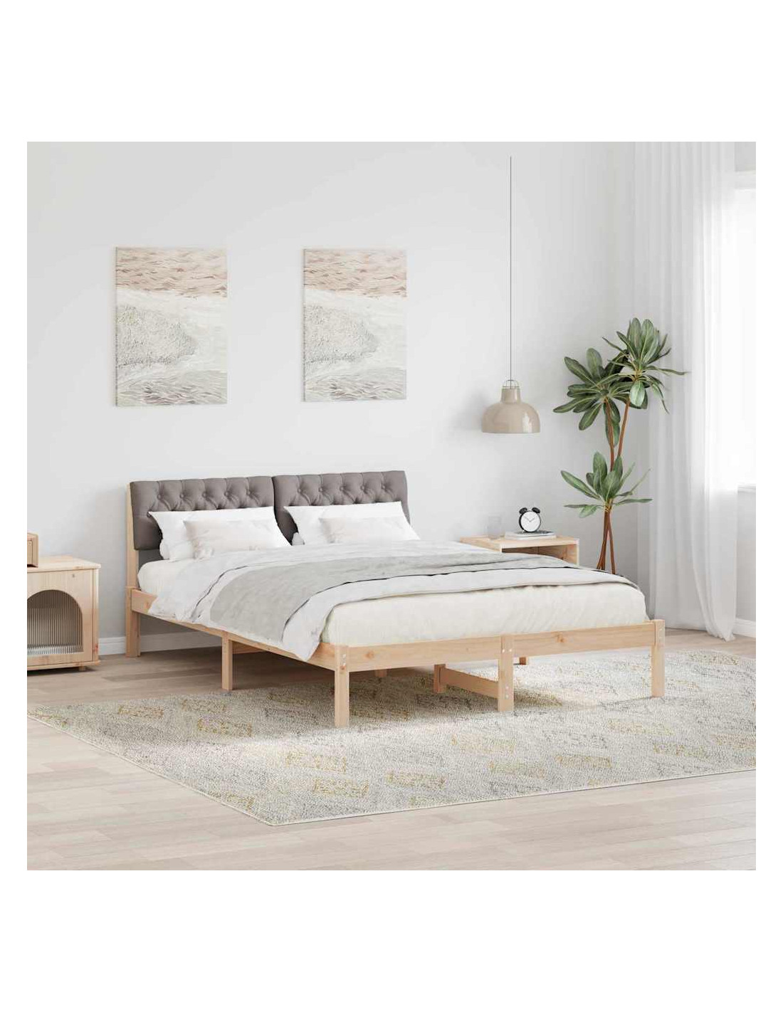 - Costruzione in legno massello di pino Il telaio in legno massello di pino è robusto e durevole, offrendo supporto per notti tranquille. La venatura naturale porta calore e carattere, rendendo il letto ancora più attraente.