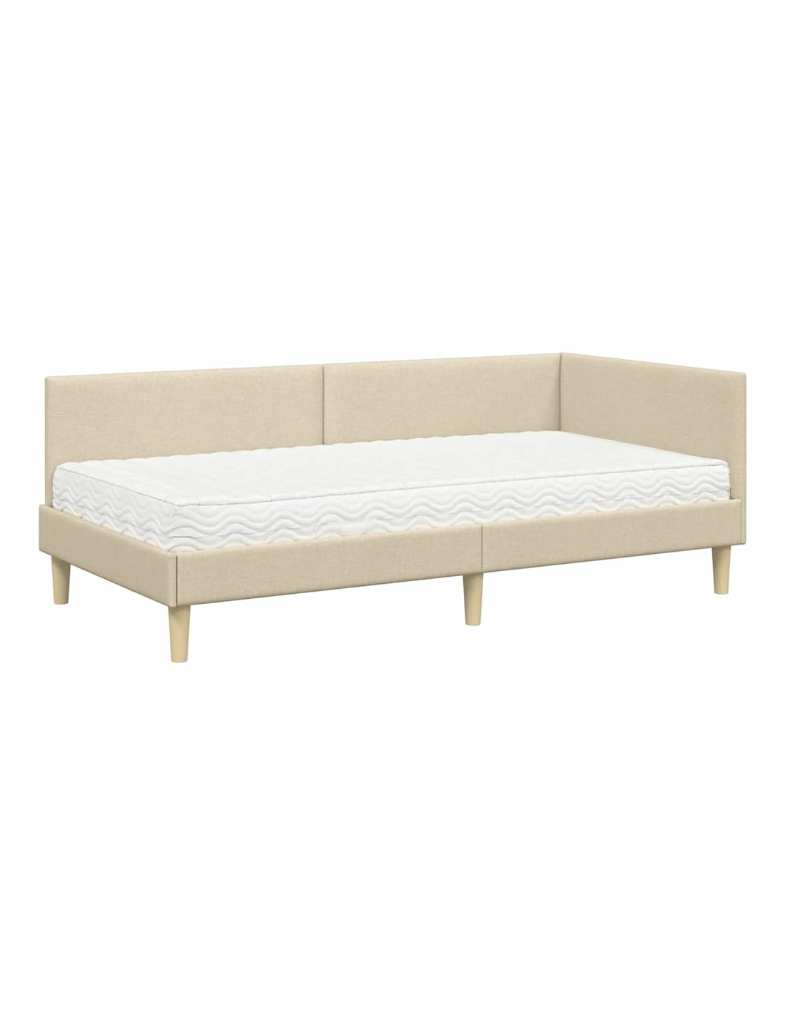 Questo letto ad angolo con materasso combina stile moderno e comfort, rendendolo un elemento centrale per ogni camera da letto. La testiera in tessuto è fissata al muro, offrendo un look ordinato e spazioso, mentre il telaio con tocchi minimalisti crea un'atmosfera serena.