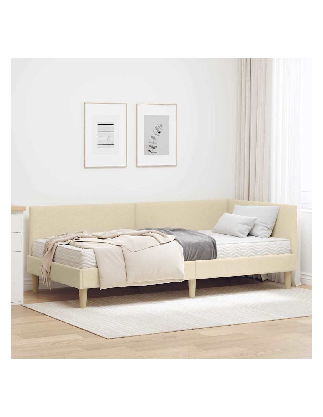 Questo letto ad angolo con materasso combina stile moderno e comfort, rendendolo un elemento centrale per ogni camera da letto. La testiera in tessuto è fissata al muro, offrendo un look ordinato e spazioso, mentre il telaio con tocchi minimalisti crea un'atmosfera serena.