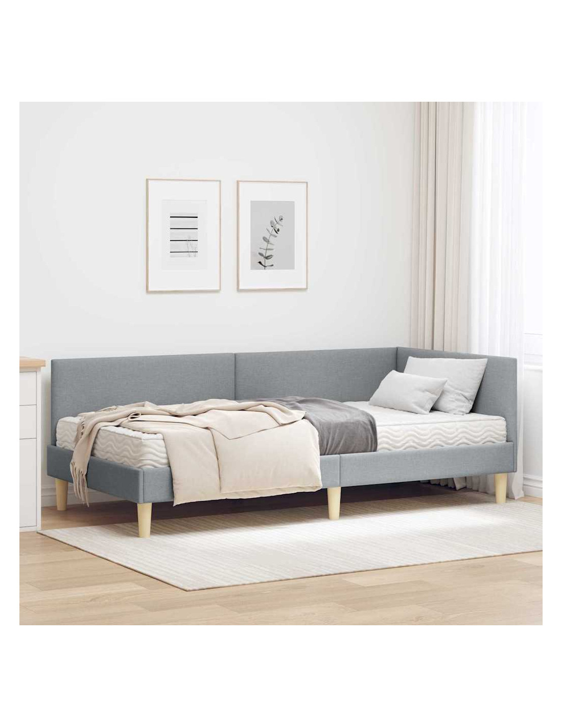 Questo letto ad angolo con materasso combina stile moderno e comfort, rendendolo un elemento centrale per ogni camera da letto. La testiera in tessuto è fissata al muro, offrendo un look ordinato e spazioso, mentre il telaio con tocchi minimalisti crea un'atmosfera serena.