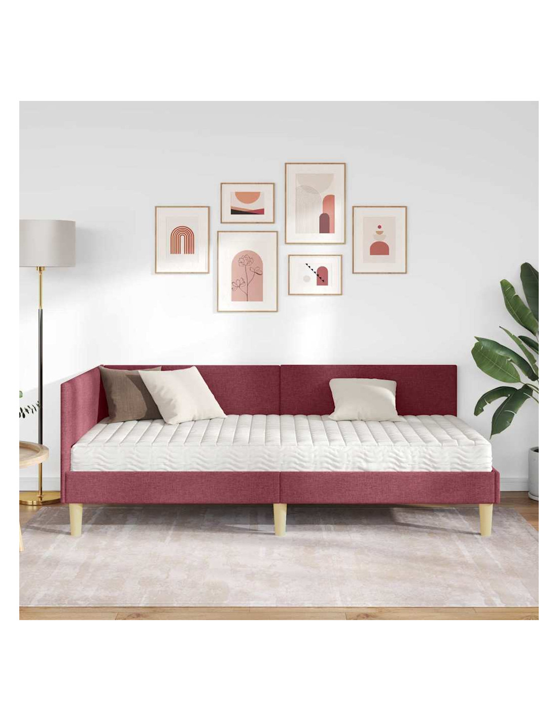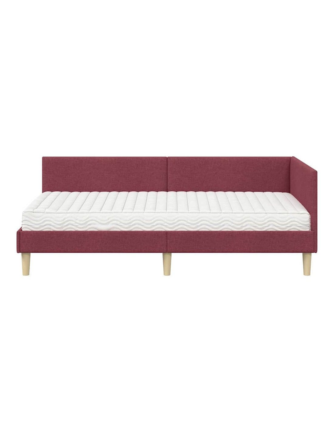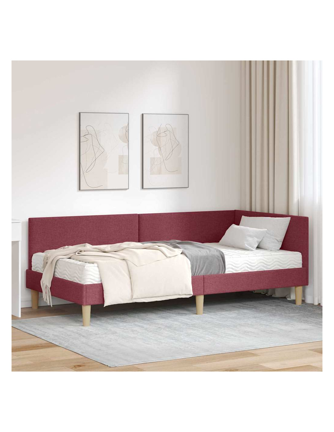Questo letto ad angolo con materasso combina stile moderno e comfort, rendendolo un elemento centrale per ogni camera da letto. La testiera in tessuto è fissata al muro, offrendo un look ordinato e spazioso, mentre il telaio con tocchi minimalisti crea un'atmosfera serena.