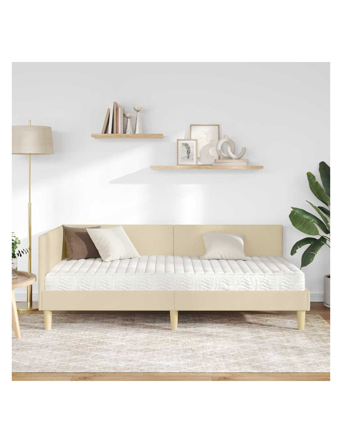 Questo letto ad angolo con materasso combina stile moderno e comfort, rendendolo un elemento centrale per ogni camera da letto. La testiera in tessuto è fissata al muro, offrendo un look ordinato e spazioso, mentre il telaio con tocchi minimalisti crea un'atmosfera serena.