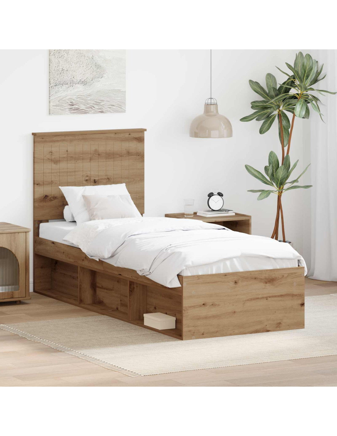 - Legno ingegnerizzato e pino massello: Il telaio è in legno ingegnerizzato, noto per la sua robustezza e stile chic. La testiera in pino massello aggiunge un tocco naturale, fornendo robustezza e un aspetto elegante. Insieme, questi materiali garantiscono forza e comfort per un buon sonno.