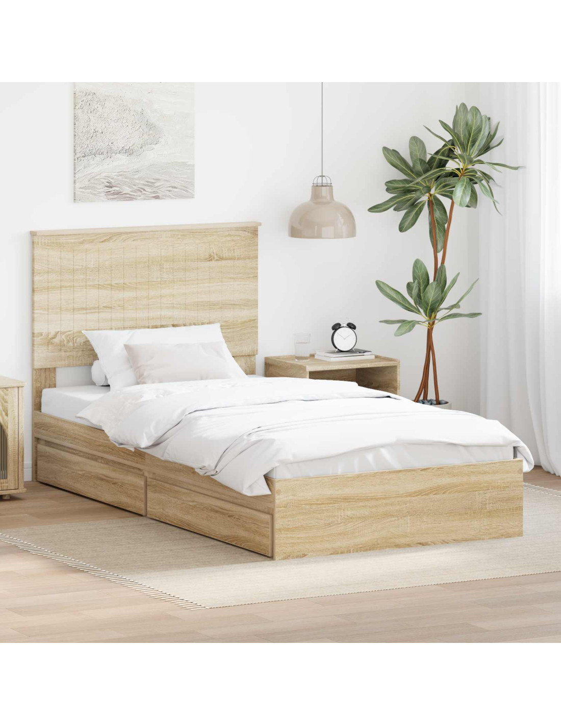 - Struttura letto in legno ingegnerizzato: Questo letto è realizzato in legno ingegnerizzato di alta qualità, durevole e pratico, per una base affidabile. Scegliamo questo materiale per la sua solidità, così offre un pezzo che rimane centrale in ogni casa moderna.