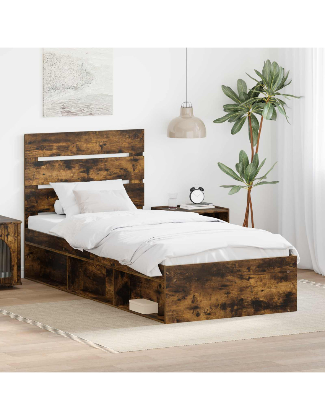 Questo telaio per letto moderno unisce linee pulite e design minimale, creando un pezzo centrale elegante per ogni camera da letto. Con il suo fascino senza tempo, è perfetto per diversi stili di arredamento, offrendo una base solida per sonni riposanti. Realizzato in legno ingegnerizzato e con una testata in legno massello di pino, porta un mix di forza, stile e praticità nella tua camera. Il suo look raffinato è una scelta vincente per case moderne e contemporanee, unendo comfort e stile.