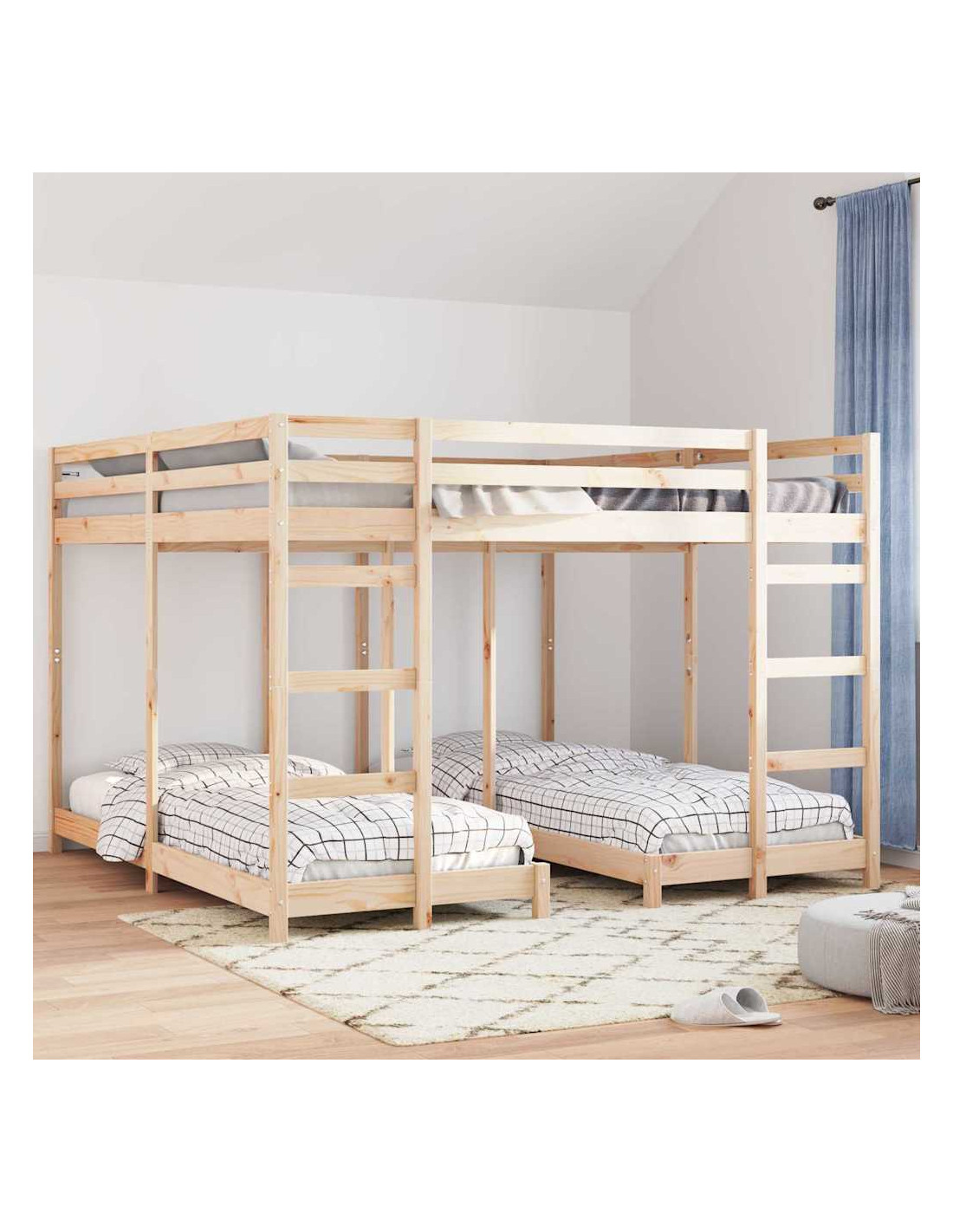Questo telaio del letto a castello triplo è una soluzione pratica e stilosa per stanze condivise, unendo design moderno e funzionalità salvaspazio. Fatto di legno massello di pino, si adatta bene a qualsiasi interno, perfetto per stanze dei bambini, ospiti o spazi ridotti. La sua robustezza mette in evidenza una bella texture in legno, abbinandosi a vari stili, offrendo così un modo pratico per ottimizzare lo spazio senza rinunciare all'estetica.