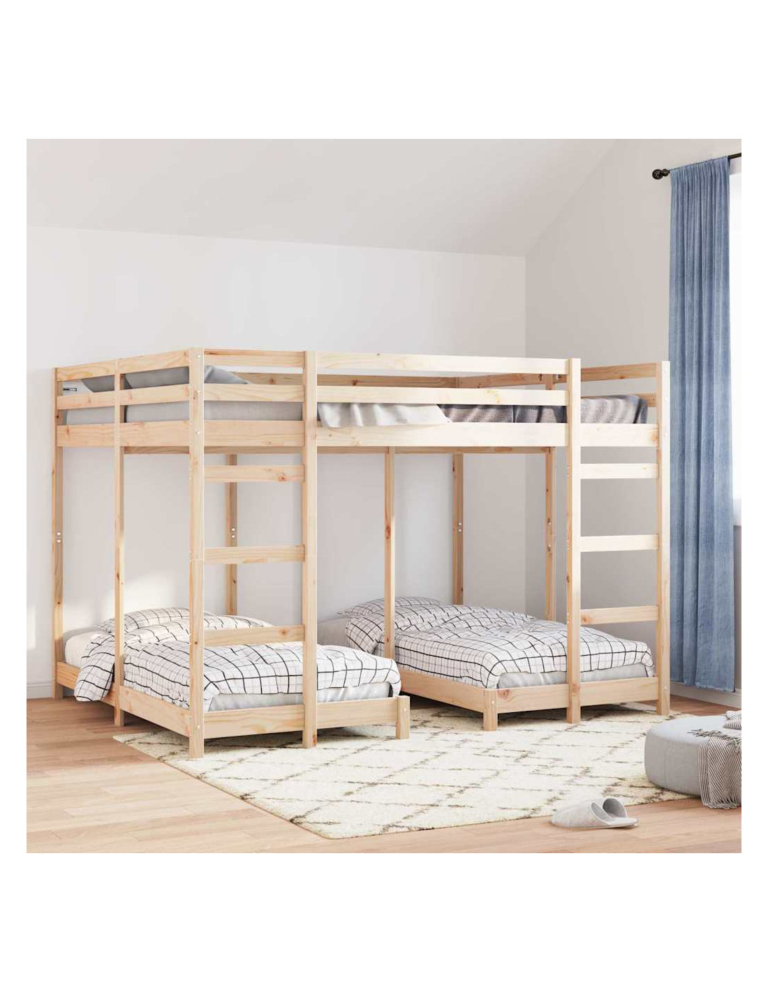 Questo telaio del letto a castello triplo è una soluzione pratica e stilosa per stanze condivise, unendo design moderno e funzionalità salvaspazio. Fatto di legno massello di pino, si adatta bene a qualsiasi interno, perfetto per stanze dei bambini, ospiti o spazi ridotti. La sua robustezza mette in evidenza una bella texture in legno, abbinandosi a vari stili, offrendo così un modo pratico per ottimizzare lo spazio senza rinunciare all'estetica.