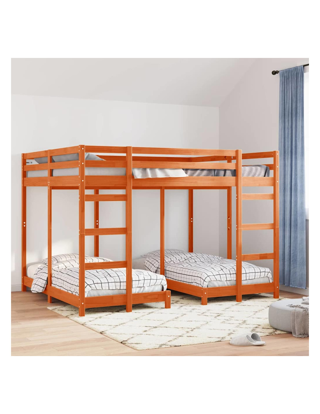 Questo telaio del letto a castello triplo è una soluzione pratica e stilosa per stanze condivise, unendo design moderno e funzionalità salvaspazio. Fatto di legno massello di pino, si adatta bene a qualsiasi interno, perfetto per stanze dei bambini, ospiti o spazi ridotti. La sua robustezza mette in evidenza una bella texture in legno, abbinandosi a vari stili, offrendo così un modo pratico per ottimizzare lo spazio senza rinunciare all'estetica.