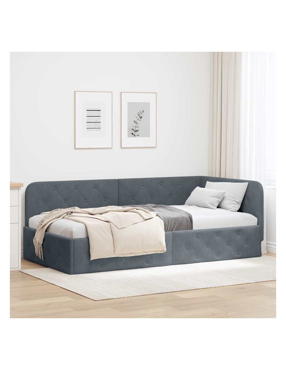 Questo letto angolare in velluto ridefinisce lo stile moderno con il suo design elegante a forma di L, ed è perfetto per qualsiasi camera da letto. Il suo rivestimento in velluto offre comfort e stile, mentre la struttura tipo piattaforma permette di posizionarlo in spazi ristretti o come pezzo centrale in stanze più grandi.